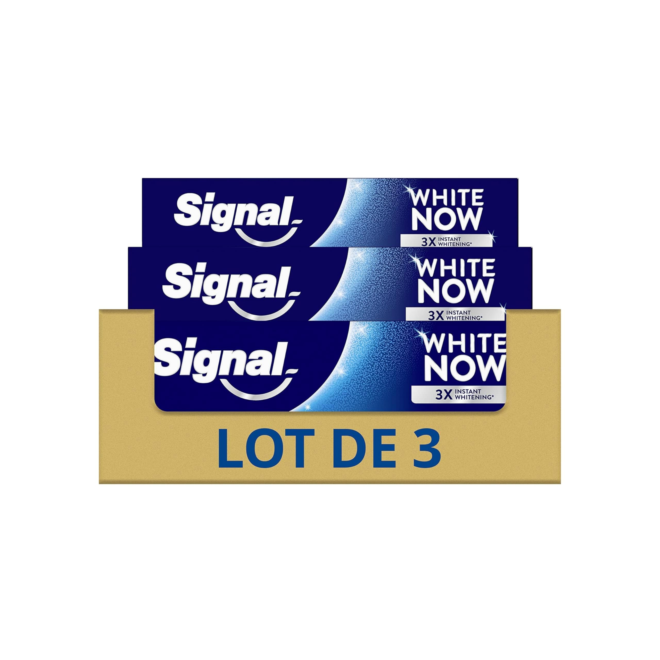The new Signal White Now Original toothpaste formula combines two clinically proven technologies: WhiteCorrect technology with blue-sapphire and green pigments that correct the color of your teeth, for a smile that's 3x whiter instantly¹, and WhiteInfinity technology with naturally sourced minerals that clean teeth and help gradually remove stains for long-lasting whiteness². This improved formula contains 94 naturally sourced ingredients. Clinically proven and enamel-friendly, White Now Original contains non-abrasive instant whitening ingredients and fluoride for daily use. Plus, the carton and soft tube of this toothpaste, made with 22 recycled plastic, are now fully recyclable. At Signal, we believe your smile is an expression of your personality and self-confidence. Our mission: to improve everyone's oral health, so that each of us can unleash the power of our smile. Signal has been helping the French since 1961 to teach them good oral hygiene habits from a young age and demonstrate the importance of brushing twice a day, morning and evening. Committed to protecting the planet, we take steps to limit the environmental impact of our products. ¹Clinically proven on 58 people compared to a standard fluoride toothpaste. Instant, temporary, optical whitening effect. ²Clinically tested on 58 people with twice-daily brushing for 4 weeks. ³The product may leave stains on textiles and plastics (e.g., toothbrushes). Wash them regularly. INGREDIENTS Hydrogenated Starch Hydrolysate, Aqua, Hydrated Silica, Sodium Lauryl Sulfate, Aroma, Cellulose Gum, Sodium Fluoride, Sodium Saccharin, PVM MA Copolymer, Glycerin, Trisodium Phosphate, Limonene, CI 74160, CI 74260. DIRECTIONS FOR USE Brush your teeth with a wet toothbrush and spit out any excess toothpaste afterward. SAFETY WARNING This product may leave stains on textiles and plastics (e.g., toothbrushes). Wash regularly. See moreFor good oral hygiene: brush your teeth after every meal, change your Signal toothbrush every 2 to 3 months, and see your dentist at least twice a year. The flexible tube, made with 20 recycled plastic, and the cardboard box of this toothpaste, manufactured in France, are fully recyclable please recycle. Clinically proven and enamel-friendly, White Now toothpaste contains non-abrasive instant whitening ingredients and fluoride for daily use. Its new and improved formula also contains naturally sourced minerals that clean teeth and help gradually remove stains for long-lasting whiteness². This whitening toothpaste formula contains blue-sapphire and green pigments that correct the color of your teeth for a smile that's 3x whiter instantly¹. The new formula of Signal White Now Original whitening toothpaste guarantees a dazzling smile from the very first brushing.SIGNAL - Dentifrice White Now Original Blancheur - Des dents 3X plus blanches dès le premier brossage - Blancheur longue durée - 94 d'ingrédients d'origine naturelle - (lot de 3x75ml) Signal Dentifrice White Now Original Plus Blanc Instantanément¹ Lot de 3x75mlDESCRIPTION DU PRODUIT DESCRIPTION DU PRODUIT La nouvelle formule du dentifrice Signal White Now Original combine deux technologies cliniquement prouvées : la technologie WhiteCorrect avec des pigments bleusaphir et verts qui corrigent la couleur de vos dents, pour un sourire 3 x plus blanc instantanément¹ et la technologie WhiteInfinity avec des minéraux d'origine naturelle qui nettoient les dents et aident à retirer les taches progressivement pour une blancheur longue durée². Cette formule améliorée comprend 94 d'ingrédients d'origine naturelle. Cliniquement prouvé et respectueux de l'émail, White Now Original contient des ingrédients blancheur instantanée non abrasifs et du fluor pour un usage quotidien. De plus, le carton et le tube souple de ce dentifrice composé de 22 de plastique recyclé sont maintenant entièrement recyclables. Chez Signal, nous pensons que votre sourire est l'expression de votre personnalité et de votre confiance en vous. Notre mission : améliorer la santé buccodentaire de tous, pour que chacun d'entre nous libère le pouvoir de son sourire. Signal accompagne les Français depuis 1961 pour leur transmettre les bons gestes, dès le plus jeune âge et démontrer l'importance d'un brossage 2 fois par jour, matin et soir. Attentifs à la protection de la planète, nous prenons des mesures pour limiter l'impact environnemental de nos produits. ¹Cliniquement prouvé sur 58 personnes comparé à un dentifrice fluoré standard. Effet blancheur instantanée optique et temporaire. ²Testé cliniquement sur 58 personnes avec un brossage deux fois par jour pendant 4 semaines. ³ Le produit peut laisser des taches sur les textiles et les plastiques (ex : brosses à dents). Lavez-les régulièrement. INGRÉDIENTS Hydrogenated Starch Hydrolysate, Aqua, Hydrated Silica, Sodium Lauryl Sulfate, Aroma, Cellulose Gum, Sodium Fluoride, Sodium Saccharin, PVM MA Copolymer, Glycerin, Trisodium Phosphate, Limonene, Cl 74160, Cl 74260. MODE D'EMPLOI Se brosser les dents avec une brosse à dents humide et cracher l'excès de dentifrice après. AVERTISSEMENT DE SÉCURITÉ Le produit peut laisser des taches sur les textiles et les plastiques (par exemple les brosses à dents). Laver régulièrement. Voir plusPour une bonne hygiène buccodentaire : brossezvous les dents après chaque repas, changez de brosse à dents Signal tous les 2 à 3 mois et consultez votre dentiste au moins 2 fois par an. Le tube souple, composé à 20 de plastique recyclé, et le carton de ce dentifrice fabriqué en France sont entièrement recyclables, pensez au tri. Cliniquement prouvé et respectueux de l'émail, le dentifrice White Now contient des ingrédients blancheur instantanée non abrasifs et du fluor pour un usage quotidien. Sa nouvelle formule améliorée contient également des minéraux d'origine naturelle qui nettoient les dents et aident à retirer les taches progressivement pour une blancheur