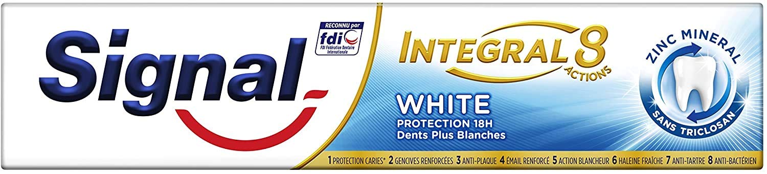 Signal Integral 8 White Toothpaste, 8 effective actions for long-lasting protection and whiter teeth. It often happens that you eat and drink during the day without being able to brush your teeth afterwards. To protect your teeth between each brushing, choose Signal Intégral 8 White. It contains an advanced formula with anti-bacterial Pro-Time Zinc for an anti-plaque effect that lasts up to 18 hours and Perlite for enhanced whitening action. A complete formula that helps you protect your teeth between each brushing. The result: long-lasting protection and 8 effective actions. 1. Help protect against cavities2. Strengthen the gums3. Provide an anti-plaque effect for up to 18 hours4. Strengthen the enamel5. Help restore the natural whiteness of teeth6. Freshen breath7. Fight the formation of tartar8. Fighting bacteriaSignal has been supporting the French since 1961 and is committed to passing on good oral hygiene practices from an early age. Good habits must be adopted by everyone, which is why Signal strives to demonstrate the importance of brushing twice a day, morning and evening. In addition, the brand collaborates closely with numerous experts and is a partner of the National College of University Dental Surgeons in Public Health. Tips for good oral hygiene: brush your teeth after every meal, change your Signal toothbrush every 2 to 3 months and see your dentist at least twice a year. Also remember to turn off the water while brushing. with brushing your teeth twice a day. SAFETY WARNING For external use only. Do not swallow. Keep out of reach of children. Stop use and consult a dentist if irritation occurs.Change your Signal toothbrush every 2 to 3 months. Cavity protection, strengthened gums, strengthened enamel, whitening action, fresh breath, anti-plaque, anti-tartar and anti-bacterial. This whitening toothpaste protects your teeth throughout the day and provides you with 8 effective actions against the most common dental problems. This toothpaste contains an antibacterial formula with Pro-Time Zinc for an action against dental plaque that lasts 18 hours. A complete formula that helps you protect your teeth between brushings. Signal Toothpaste Integral 8 White contains Perlite for whiter teeth. Le Dentifrice Signal Intégral 8 White, 8 actions efficaces pour une protection longue durée et des dents plus blanches. Il arrive souvent de manger et de boire pendant la journée sans pouvoir se brosser les dents après. Pour protéger vos dents entre chaque brossage, choisissez Signal Intégral 8 White. Il contient une formule avancée au Pro-Time Zinc anti-bactérien pour un effet anti-plaque qui dure jusqu'à 18 heures et de la Perlite pour une action blancheur renforcée. Une formule complète qui vous aide à protéger vos dents entre chaque brossage. Le résultat : une protection longue durée et 8 actions efficaces. 1. Aider à protéger contre les caries2. Renforcer les gencives3. Offrir un effet anti-plaque jusqu'à 18 heures4. Renforcer l'émail5. Aider à retrouver la blancheur naturelle des dents6. Rafraîchir l'haleine7. Combattre la formation du tartre8. Lutter contre les bactériesSignal accompagne les Français depuis 1961 et s'engage pour transmettre les bons gestes d'hygiène bucco-dentaire, et ce dès le plus jeune âge. Les bonnes habitudes doivent être prises par tous, c'est pourquoi Signal s'applique à démontrer l'importance d'un brossage deux fois par jour, matin et soir. De plus, la marque collabore étroitement avec de nombreux experts et est partenaire du Collège National des Chirurgiens-Dentistes Universitaires en Santé Publique. Conseils pour une bonne hygiène bucco-dentaire : brossez-vous les dents après chaque repas, changez de brosse à dents Signal tous les 2 à 3 mois et consultez votre dentiste au moins deux fois par an. Pensez également à couper l'eau pendant le brossage. avec un brossage des dents deux fois par jour. AVERTISSEMENT DE SÛRETÉ Pour une utilisation externe uniquement. Ne pas avaler. Conserver hors de portée des enfants. Arrêter l'utilisation et consulter un dentiste si irritation.Changez de brosse à dents Signal tous les 2 à 3 mois. Protection caries, gencives renforcées, émail renforcé, action blancheur, haleine fraîche, anti-plaque, anti-tartre et anti-bactérien. Ce dentifrice blancheur protège vos dents tout au long de la journée et vous apporte 8 actions efficaces contre les problèmes dentaires les plus fréquents. Ce dentifrice contient une formule antibactérienne au Pro-Time Zinc pour une action contre la plaque dentaire qui dure 18 heures. Une formule complète qui vous aide à protéger vos dents entre chaque brossage. Signal Dentifrice Integral 8 White contient de la Perlite pour des dents plus blanches.