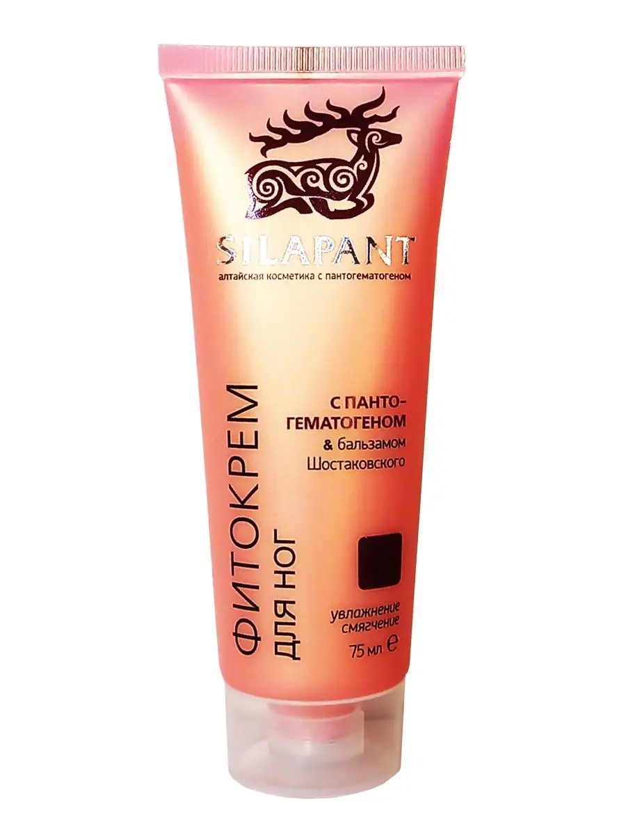 Фитокрем для ног, от известного производителя "СИЛАПАНТ", алтайская косметика с пантогематогеном. Смягчает, увлажняет и питает кожу стоп. Препятствует образованию мозолей. Бальзам Шостаковского - обладает антисептическим и ранозаживляющим действиями. Карбамид - уменьшает сухость и шелушение, смягчает огрубевшую кожу стоп.