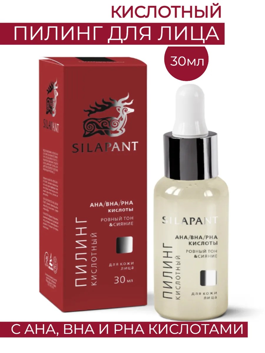 Силапант Кислотный пилинг для лица с AHA, BHA и PHA кислотами 30 мл всесезонный пилинг на основе AHA (26 %) и BHA (2 %) РНА кислот, эффективно отшелушивает и борется с несовершенствами кожи. Оригинальный комплекс кислот придает ей сияние, выравнивает текстуру, очищает поры, способствует осветлению пигментации. Молочная кислота с высокой проникающей способностью оказывает активное увлажняющее и отбеливающее действие. Гликолевая кислота способствует активному отшелушиванию, помогает выровнять тон кожи, мягко осветляет пигментные пятна, обновляет, очищает и сужает поры. Пилинг для лица восстанавливает, омолаживает, обладает антиоксидантным действием. Видимый результат ухода за кожей без шелушения уже после 1 процедуры! Ровный тон кожи и сияющий цвет лица, заметный Anti-Age эффект, регенерация, осветление пигментации и борьба с постакне, глубокое очищение кожи. Результат на лицо: гладкая кожа, свежий цвет, сглаженные поверхностные морщины, тонус и сияние дермы, сужение пор, увлажнение. Показания к применению: усталая, сухая кожа, атоничные участки, мелкие морщины, тусклый цвет лица, огрубевшие участки, обезвоженность, признаки фотостарения, легкие контурные изменения. Способ применения уходовой косметики в домашних условиях: Равномерно нанесите на чистое и сухое лицо (лоб, нос, подбородок, щеки), избегая области вокруг глаз, не более чем на 10 минут, затем тщательно смойте водой. Не применяйте на влажной, чувствительной и поврежденной коже. При использовании может ощущаться легкое покалывание, а после - легкое покраснение кожи, поэтому рекомендуем после процедуры нанести увлажняющий крем. Меры предосторожности: при сильном жжении-сразу смыть пилинг водой. После использования нанесите перед выходом на улицу солнцезащитный крем.