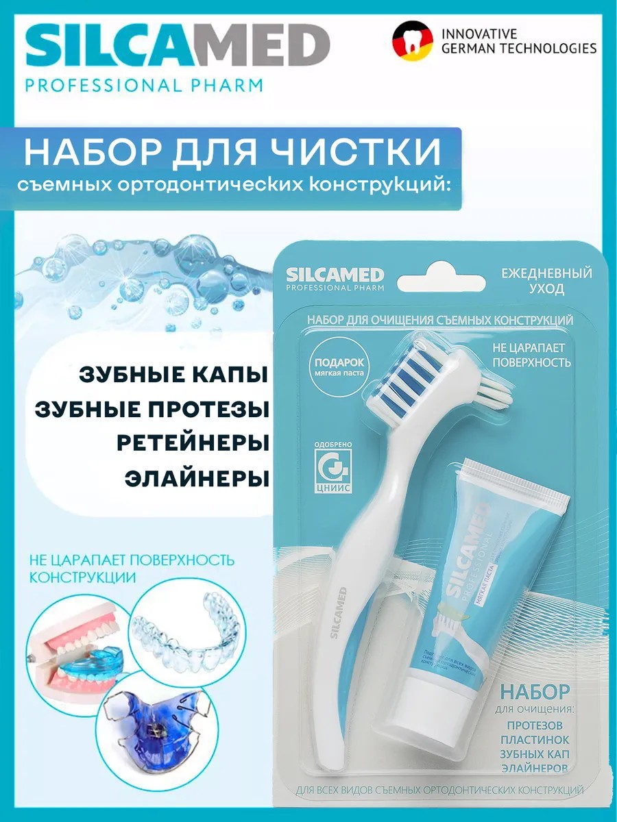 Набор для чистки съемных зубных конструкций идеально очистит зубные протезы, капы, ретейнеры и элайнеры. Правильный уход - гарантия долгой службы дорогостоящих конструкций и сохранения свежего дыхания.
