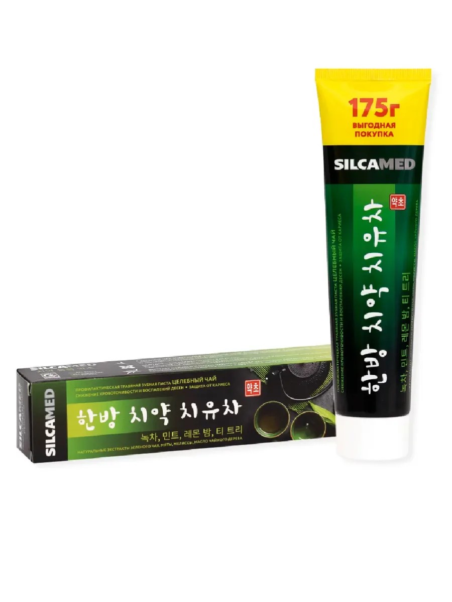 Silca Med. Зубная паста Корейские секреты Целебный чай, 175г. Натуральный комплекс, в который входит экстракт зеленого чая, экстракт листьев мелиссы лекарственной, экстракт листьев мяты перечной и эфирное масло чайного дерева эффективно устраняет кровоточивость десен, подтягивает и укрепляет ткани, снимает раздражения слизистой, усиливает кровообращение и способствует заживление повреждений на деснах.