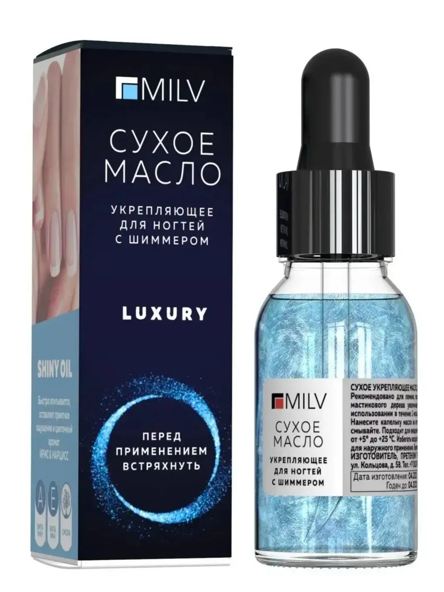 Dry strengthening nail oil with shimmer - ensures quick and deep absorption, leaving a velvety feel on the skin. Dry cuticle oil applies pleasantly. Thanks to its specially developed formula, the oil protects against dryness, nourishes, and gives hands a well-groomed appearance, without leaving a sticky residue, greasy shine, or filmy feeling. Mastic resin in the product increases the strength of nails with daily use for 1 month. The nail oil has a sweet marshmallow aroma that lifts the mood, and fine particles give the skin a shimmering glow. How to use: Shake the bottle before use. Apply a drop of oil to the nail. Massage into the nail and cuticle area. Do not rinse. Suitable for daily use.