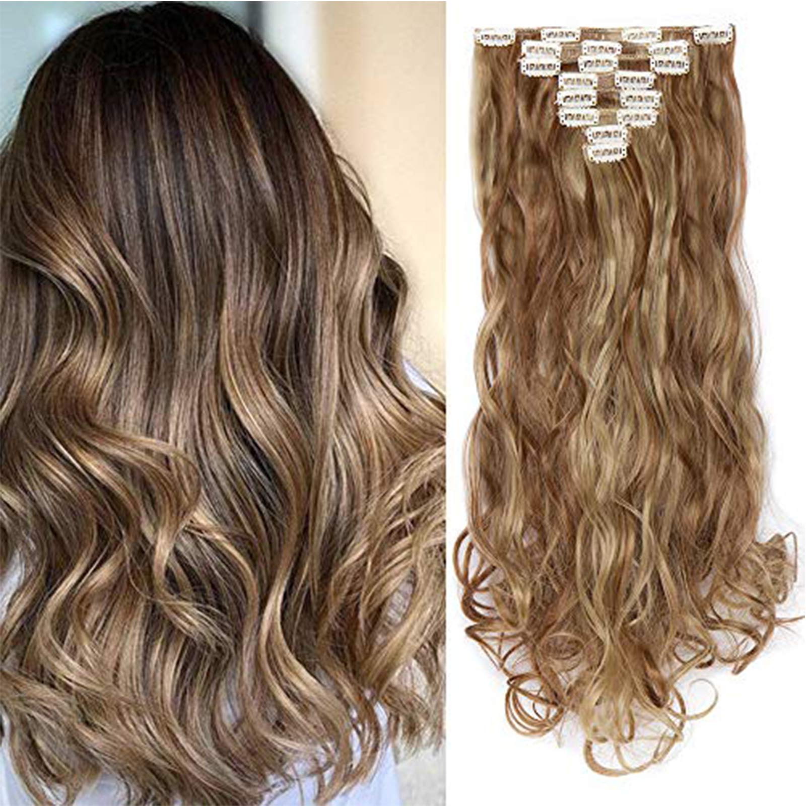 Silk-co Hairpiece Extensions Clip in Hair Extension Long Curly Wavy 8 Pcs Full Head 18 Clips Synthetic Heat Resistant 24 inch Light Brown&Blond 24 Inch Curly #Light Brown&Blond