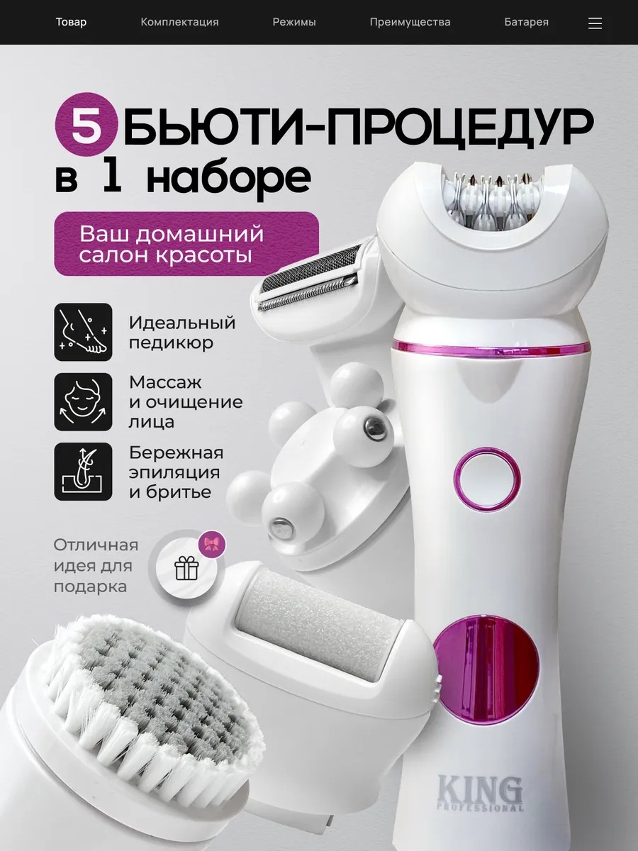 Ищите эпилятор женский беспроводной водонепроницаемый? Устали использовать кучу разных девайсов для лица, массажа и ухода за кожей ног? Мы рады представить наш многофункциональный набор для депиляции - эпилятор 5 в 1 это набор для работы с кожей! Наши бьюти гаджеты для лица и тела сделают уход за собой проще и эффективнее!