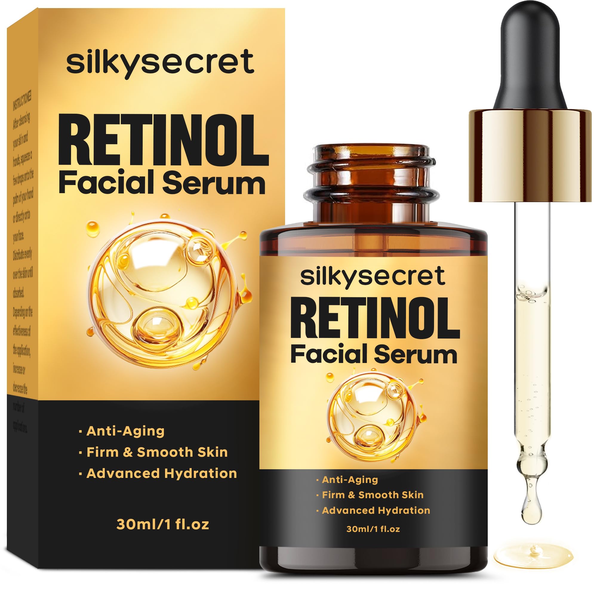 All Skin Types: SilkySecret Retinol Anti-Aging Serum isn't just for women – men can benefit from its transformative properties too. With a natural and gentle formula, it is free from harmful chemicals, making it suitable for all skin types, including sensitive skin. Evens Skin Tone: SilkySecret Retinol Serum includes Niacinamide and vitamin C, which effectively improves uneven skin tone, reduces dark spots and dullness, and makes your skin look more smooth and even. Repair Renew: The combination of retinol and other active ingredients promotes skin cell renewal and repair, restoring skin elasticity and firmness while repairing damaged skin.This formidable combination works wonders to resurface your skin, reduce dark spots, and deliver a youthful glow. Deep Hydration: Rich in hyaluronic acid, it deeply hydrates the skin, keeping it smooth and supple while enhancing the skin's barrier function to prevent dryness and flakiness. Combat wrinkles, sun damage, and lackluster skin effortlessly while enjoying a lightweight, non-greasy formula that's gentle even on sensitive skin. Potent Anti-Aging: SilkySecret Retinol Anti-Aging Serum is a top-tier potion boasting a potent blend of 2 retinol, hyaluronic acid, vitamin C, and vitamin E. This skincare marvel is a game-changer for your daily routine, effectively reducing fine lines and wrinkles, slowing down the aging process, offering unparalleled hydration and skin rejuvenation.