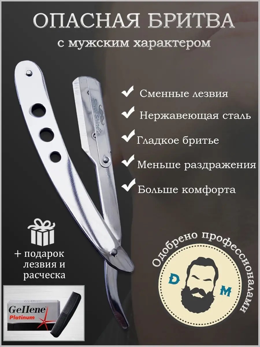 Опасная бритва для бороды изготовлена из высококачественной нержавеющей стали. Угол бритвы для лица сделан так что бы избежать порезов и ссадин при бритье. Надежная фиксация лезвий делает процесс бритья комфортнее. При покупки бритвы для мужчин, в подарок вы получаете лезвие для бритвы 5 штук и расческа для бороды и усов. Это идеальный инструмент для создания ровных и четких контуров усов и бороды. Вы получите безопасный уход за бородой, которое принесет вам массу удовольствия. Бритва мужская с лезвиями прекрасно подойдет как для личного так и для профессионального использования. Вы можете купить бритву для себя или в подарок на день рождение мужчине. Бритва шаветка для бороды послужит стильным и недорогим подарком на 23 февраля и день рождения. Бритва опасная со сменными лезвиями идеально дополнит ваш набор для ухода за бородой. Лезвие бритвы острые. Стильная опасная бритва шавет станет отличным подарком для мужчин, предпочитающих классическое бритье. Шаветка отличается от обычных бритв для мужчин тем, что можно менять лезвия по мере их затупления, а значит не только сэкономить на заточке лезвия, но и не беспокоиться о возможных порезах и раздражении, просто смените лезвие когда это необходимо.