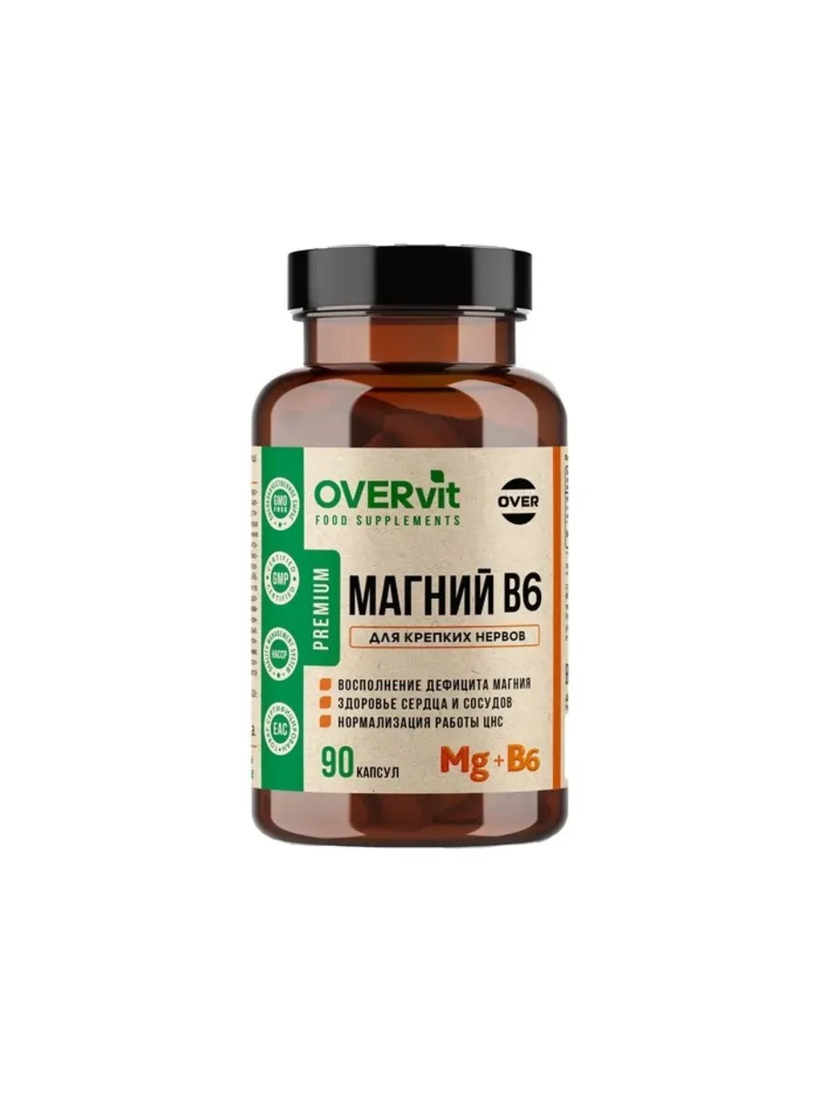 Magnesium is a fundamental structural element of living organisms and an essential component of the human body, responsible for the smooth functioning of all body systems, particularly the immune, nervous, and musculoskeletal systems. Magnesium is an anti-stress mineral, helping the body withstand increased emotional stress. A vitamin complex containing this mineral (magnesium B6, magnesium B6) is responsible for the health of the nervous and cardiovascular systems. Magnesium B6 normalizes blood pressure and prevents muscle spasms. OVERvit Magnesium B6 is contained in a bioavailable form – magnesium citrate. The citrate form is easily absorbed and well-tolerated by the gastrointestinal tract. Experts recommend taking magnesium together with vitamins B and D. Magnesium vitamins OVERvit contain in a composition with pyridoxine - vitamin B6 - for better absorption of magnesium in the body. Vitamins for women and vitamins for men often contain magnesium citrate in their complex to support the functioning of the nervous system and reduce anxiety. strongComposition: /strong magnesium citrate, gelatin capsule (gelatin, water, dye - titanium dioxide), filler - microcrystalline cellulose, anti-caking agents - magnesium stearate, amorphous silicon dioxide, pyridoxine hydrochloride (vitamin B6). strongRelease form: /strong Capsules weighing 620 mg +/- 10% OVERVIT 6 capsules (daily dosage) contain: Magnesium - 450 mg in the form of magnesium citrate - 2,958 mg. Vitamin B6 - 5.1 mg.