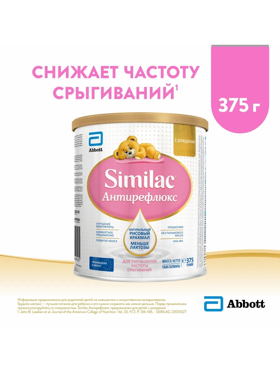 Similac Антирефлюкс – специализированная низколактозная смесь для уменьшения частоты срыгиваний у детей на искусственном вскармливании, подходит при сочетании срыгиваний и симптомов лактазной недостаточности: жидкого стула и вздутия. Данная смесь не должна использоваться для вскармливания детей с галактоземией.