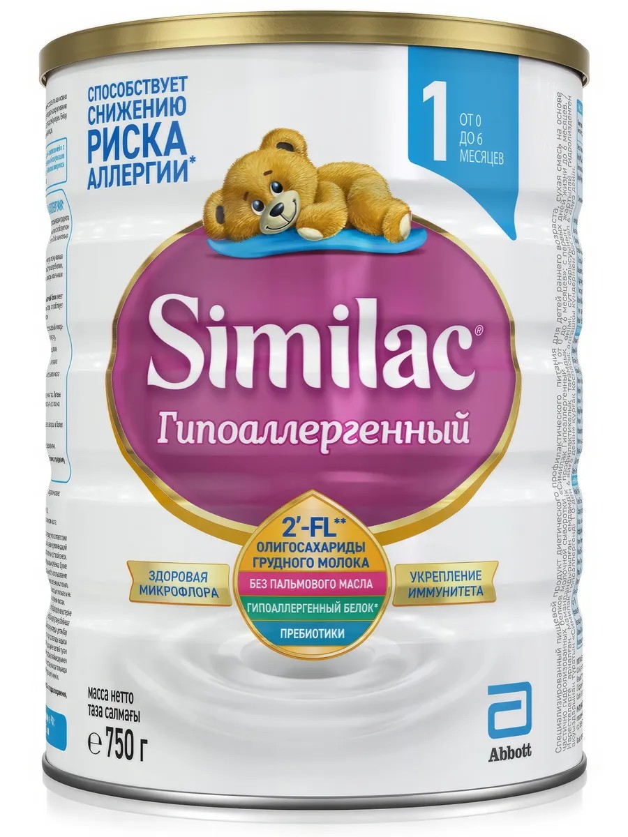 Заменитель грудного молока Similac Гипоаллергенный 1, 750г состав для детей с риском аллергии. Он содержит олигосахариды грудного молока 2'-FL уникальный ингредиент, который ранее был обнаружен только в грудном молоке. Это вещество стимулирует рост полезных бактерий в кишечнике, защищает организм ребенка от инфекций и способствует укреплению иммунитета. Частично гидролизованный сывороточный белок имеет сниженную аллергенность и поэтому способствует уменьшению риска развития аллергии. Пребиотики FOS являются пищей для полезной микрофлоры кишечника, способствуют мягкому стулу.