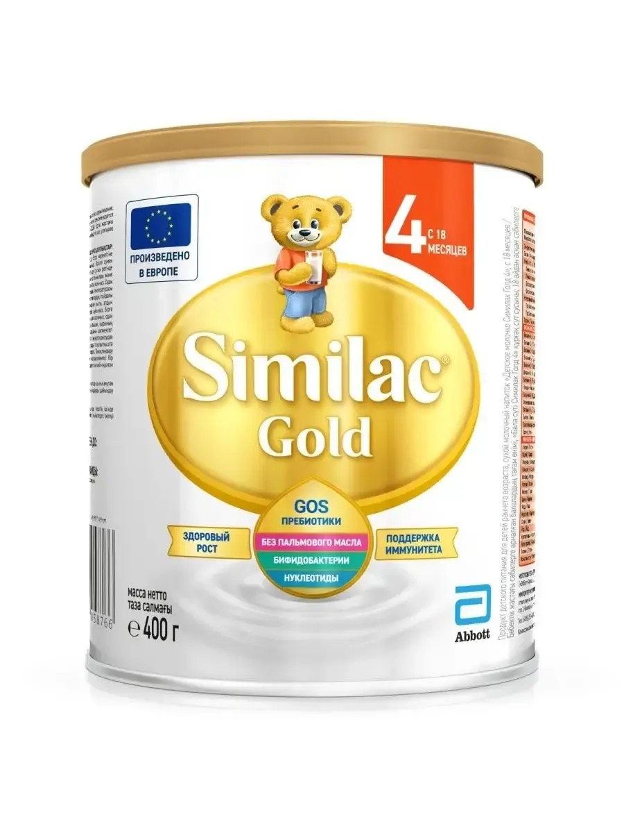 Специалисты не рекомендуют давать детям до 3 лет в качестве напитка цельное молоко из-за слишком высокой концентрации белка и недостаточного содержания железа. Детское молочко Similac Gold 4 - смесь для комфортного пищеварения и поддержки иммунитета. Содержание белка и железа в смеси соответствует потребностям детского организма. Пребиотики GOS для поддержки полезной микрофлоры кишечника Бифидобактерии B.lactis для здорового пищеварения Без пальмового масла для уменьшения запоров и более высокого усвоения кальция Омега-3 и Омега-6 для развития мозга Витамины и минералы для здорового роста. По сравнению со смесями на основе пальмового масла. Грудное молоко - лучшее питание для ребёнка, его необходимо сохранять как можно дольше. Перед применением необходима консультация специалиста. Similac Gold 4 предназначен для детей с 18 месяцев.