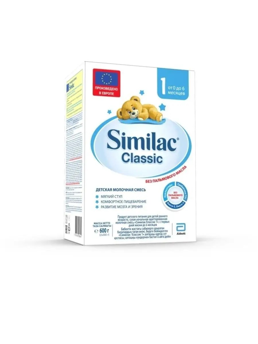 SIMILAK CLASSIC IS MANUFACTURED IN EUROPE according to the highest quality standards and helps create a strong foundation for your baby's further development, providing reliable support for the health of a child on mixed or artificial feeding: comfortable digestion and full development. GOS PREBIOTICS to support beneficial intestinal microflora. WITHOUT PALM OIL to reduce constipation and improve calcium absorption*. OMEGA 3, OMEGA 6 for brain and vision development. VITAMINS and MINERALS for harmonious growth and development. NUCLEOTIDES for the maturation of the gastrointestinal tract. *Compared to palm oil-based formulas. Breast milk: the best nutrition for a child, it should be stored as long as possible. Before use, consult a specialist. The age for using the formula is indicated on the packaging.