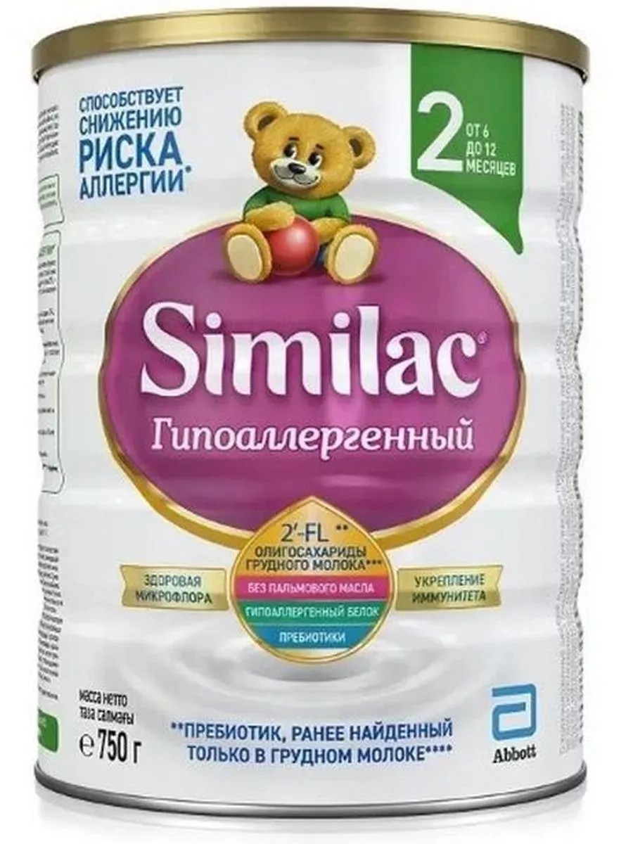 СИМИЛАК ГИПОАЛЛЕРГЕННЫЙ 2 СМЕСЬ СУХ Д/ДЕТ 750,0Смесь Симилак Гипоаллергенный 2 ( Similac Hipoallerg 2) - детская смесь на основе частично гидролизованного белка молочной сыворотки для вскармливания детей старше 6 месяцев с повышенным риском аллергии.Возраст: от 6 до 12 месяцевВАЖНО: для питания детей раннего возраста предпочтительнее грудное вскармливание.Грудное молоко - лучшее питание для ребенка, его необходимо сохранять как можно дольше.Если грудное вскармливание невозможно и у ребенка повышен риск аллергии, по рекомендации врача для питания таких детей с 6 до 12 месяцев может быть использована смесь Симилак Гипоаллергенный 2.Similac Гипоаллергенный с олигосахаридами грудного молока 2'-FL для детей с риском аллергии - новое поколение гипоаллергенных смесей с олигосахаридами грудного молокаSimilac Гипоаллергенный - смесь для детей с риском аллергии с олигосахаридами грудного молока 2'-FL1 - уникальным ингредиентом, который ранее был обнаружен2 только в грудном молоке. Новый олигосахарид грудного молока 2'-FL - еще один компонент подтвержденного исследованиями комплекса Similac для комфортного пищеварения и укрепления иммунитета.-Similac Гипоаллергенный содержит олигосахариды 2'-FL, которые стимулируют рост полезных бактерий в кишечнике, защищают организм ребенка от инфекций и способствуют укреплению иммунитета.-Частично гидролизованный сывороточный белок имеет сниженную аллергенность и поэтому способствует уменьшению риска развития аллергии.-Пребиотики FOS являются пищей для полезной микрофлоры кишечника, способствуют мягкому стулу.-Нуклеотиды - строительный материал для ДНК всех клеток организма.-Отсутствие пальмового масла способствует уменьшению запоров и более высокому усвоению кальция3 .Эффективность Similac подтверждена клиническими исследованиями.ТЕПЕРЬ ЕЩЕ БЛИЖЕ К ГРУДНОМУ МОЛОКУ4.CНИЖЕНИЕ РИСКА РАЗВИТИЯ АЛЛЕРГИИПОДДЕРЖКА ИММУНИТЕТАТеперь еще ближе к грудному молоку, чем когда-либо3Similac Гипоаллергенный с олигосахаридами грудного молока 2' - FL для с