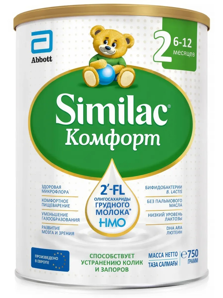 Similac Комфорт - сухая смесь на основе частично гидролизованного сывороточного белка, способствует устранению колик и запоров, единственная в России смесь типа Комфорт с олигосахаридами грудного молока 2'-FL для укрепления иммунитета. Подходит для детей с запорами, коликами и повышенным газообразованием, которые находятся на ИВ Similac Комфорт не предназначен для вскармливания детей с галактоземией, с подозрением на аллергию к белкам коровьего молока (АБКМ) или с подтвержденной АБКМ. От компании Abbott одной из ведущих международных компаний в сфере здравоохранения. Производится в Европе на основе последних научных данных и в соответствии с высокими стандартами качества. Содержит 2-FL олигосахариды грудного молока для укрепления иммунитета и защиты от инфекций. Не содержит пальмового масла, ГМО, красителей, консервантов и глютена В составе натуральные растительные масла. Специальный состав Similac Комфорт для полноценного роста и развития малыша имеет ряд преимуществ: - Частично гидролизованный сывороточный белок легко переваривается и способствует уменьшению колик и запоров; - Олигосахариды грудного молока 2'-FL стимулируют рост полезных бактерий в кишечнике, защищают организм ребенка от инфекций и способствуют укреплению иммунитета; - Низкий уровень лактозы способствует уменьшению избыточного газообразования и беспокойства; - Бифидобактерии B. lactis эффективный и хорошо изученный пробиотик, помогает развитию полезной микрофлоры кишечника и поддержанию здоровья пищеварительной системы; - Пребиотики FOS являются пищей для полезной микрофлоры кишечника, способствуют мягкому стулу; - Омега-3 и Омега-6, включая DHA и ARA незаменимые жирные кислоты для развития мозга и зрения; - Лютеин входит в состав грудного молока и важен для здоровья глаз, не вырабатывается в организме, поэтому малыш может получить его только с питанием;- Нуклеотиды строительный материал для ДНК всех клеток организма