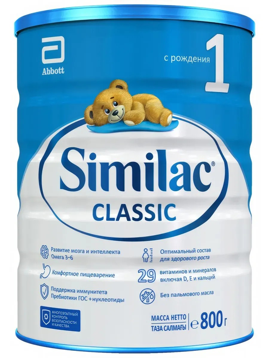 Similac Classic производится в соответствии с высокими стандартами качества и помогает создать крепкий фундамент для дальнейшего развития Вашего малыша, обеспечивая надежную поддержку здоровья ребенка: комфортное пищеварение и полноценное развитие. От компании Abbott одной из ведущих международных компаний в сфере здравоохранения. Не содержит пальмовое масло, ГМО, красители, консерванты и глютен. Сбалансированный состав Similac Classic для полноценного роста и развития: - Пребиотики GOS - натуральные пищевые волокна, способствующие росту полезной микрофлоры кишечника и формированию мягкого стула- Нуклеотиды - важные компоненты для созревания желудочно-кишечного тракта- Омега-3 и Омега-6, включая DHA и ARA - незаменимые жирные кислоты для развития мозга и зрения- Витамины и минералы (С, D, E, Ca, Mg, P и другие) - необходимы для гармоничного роста и развития ребенка- Без пальмового масла - способствует уменьшению запоров и более высокому усвоению кальция для формирования здорового скелета. Отсутствие пальмового масла способствует уменьшению запоров и более высокому усвоению кальция. Важно: грудное молоко - лучшее питание для ребёнка, его необходимо сохранять как можно дольше. Перед применением необходима консультация специалиста. Возраст применения смеси указан на упаковке.