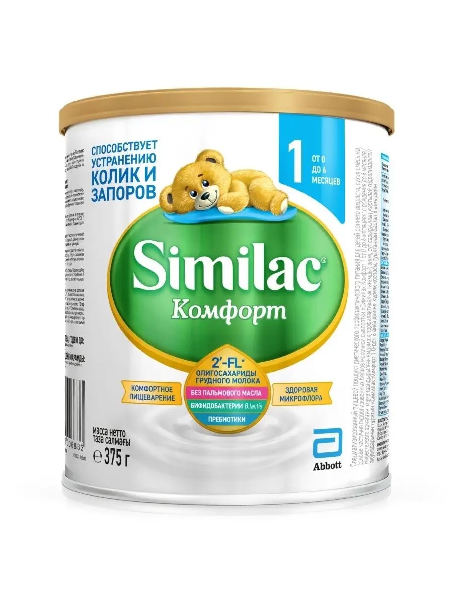 Сухое молочное питание Симилак Комфорт 1 благодаря содержанию частично гидролизованного сывороточного белка, отсутствию в составе пальмового масла способствует снижению риска возникновения колик и запоров у малышей. Еда ребенка с рождения должна быть питательной, полезной, сбалансированной. С детской смесью Симилак 1 Комфорт малыш получает необходимые для жизни, укрепления иммунитета, развития зрения и быстрого роста олигосахариды грудного молока 2' -FL, витамины, минералы, жирные кислоты omega-3, омега-6 (содержатся в рыбьем жире), лецитин, пребиотики и бифидобактерии. Для новорожденных малышей на искусственном, смешанном вскармливании заменитель грудного молока SimilacКомфорт 1 оптимальный вариант детского питания. Имеет в составе растительные кокосовое, высокоолеиновое подсолнечное, соевое масло; без глютена, с пониженным содержанием лактозы (для комфортного пищеварения). С Симилак смесь Вы получаете полноценное питание качества premium для ребенка в удобной упаковке - банке 375 г.