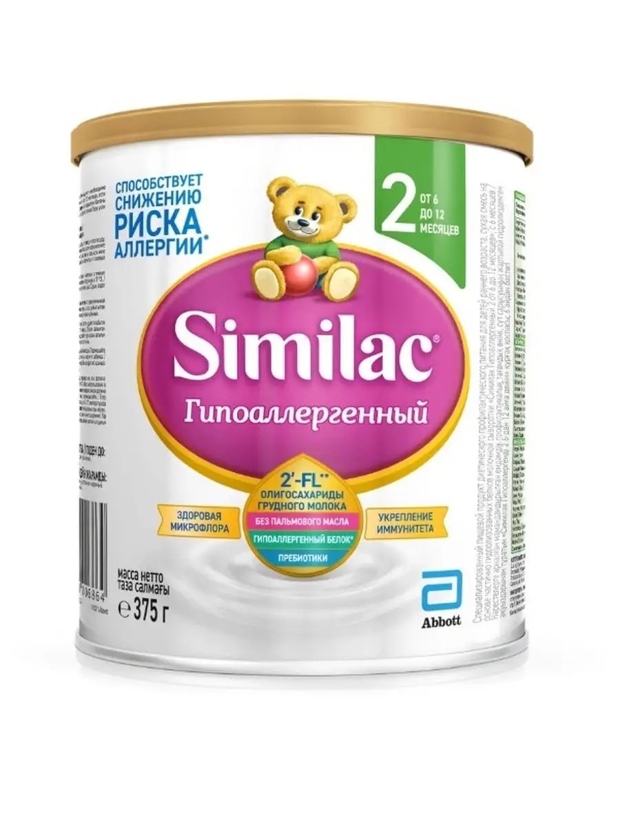 SIMILAC ГА 2 Гипоаллергенная Смесь с Олигосахаридами Грудного Молока {с 6 мес} 375г - еда, предназначенная для малышей 6-12 мес. на искусственном, смешанном вскармливании с риском развития аллергии. Некоторым малышам с рождения дают смесь молочную Симилак гипоаллергенный, что способствует полноценному развитию ребенка, жизни без аллергии (в составе частично гидролизованный сывороточный белок). Благодаря заменителю грудного молока Симилак, питание ребенка сбалансированное, рацион богат минералами (магний, железо и др.) и витаминами (В12 для умственного развития, Д3 для усвоения кальция и др.). Омега-3 и omega-6 (содержатся в рыбьем жире) благоприятно влияют на развитие мозга, лютеин -на здоровье глаз, а пониженное содержание лактозы способствует комфорту малыша, снижает риск возникновения колик. Для нормальной работы кишечника детское питание Симилак с бифидобактериями. Продукт без глютена, пальмового масла, использованы растительные масла: кокосовое, подсолнечное, соевое. Выпускается не в мягкой упаковке в удобной баночке.