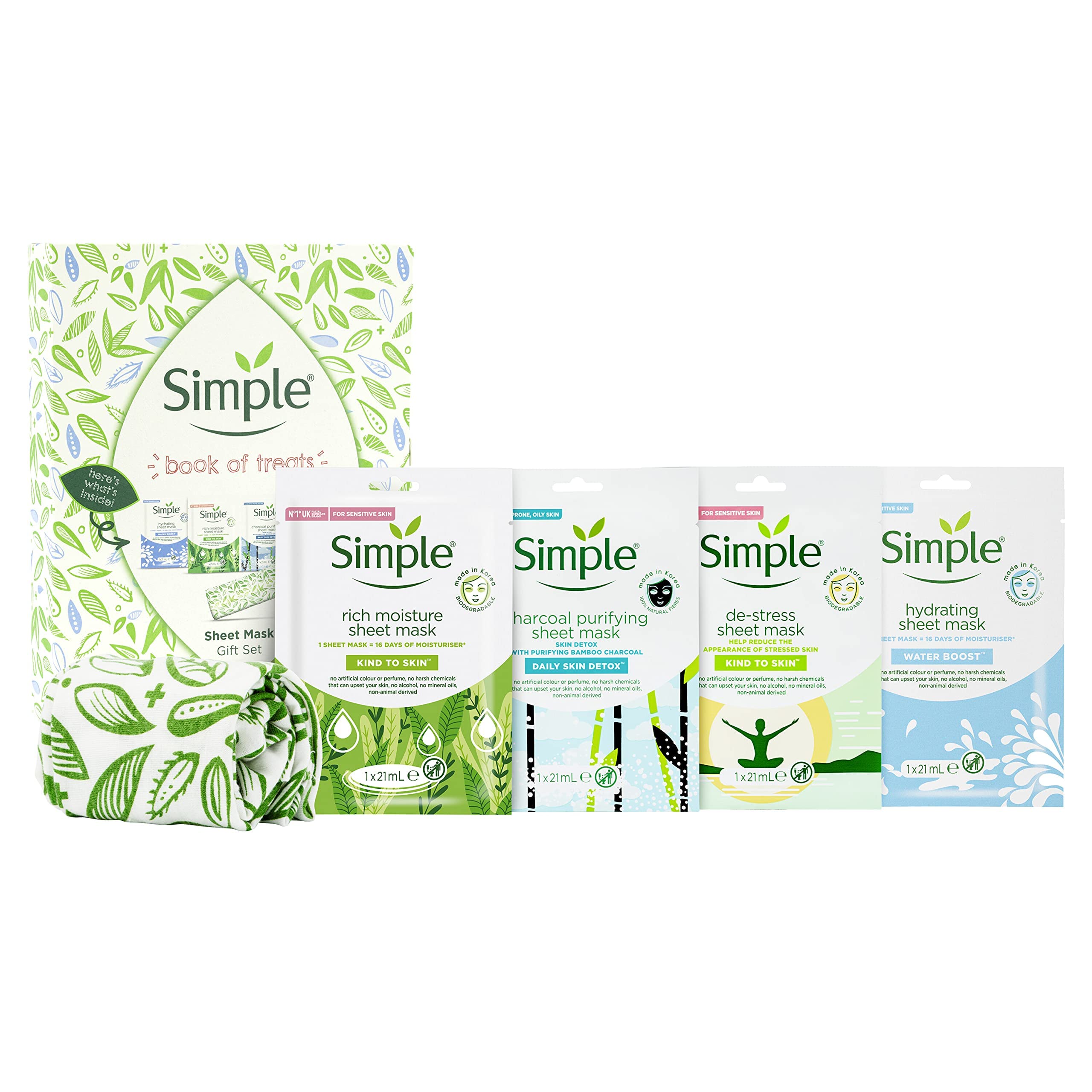 Know someone who is totally and utterly into taking care of their skin in the kindest way possible? The Simple Book of Treats Gift Set will make their entire day – a foldout book with four of our favourite sheet masks. Right from the get-go, the Simple philosophy has always been about being kind to skin, even the most sensitive. Because all skin can be sensitive at times. That's why this set of Christmas gifts comes with an abundance of Simple sheet masks that are kind to their skin. Simple Water Boost Hydrating sheet mask tackles the five signs of skin dehydration and gives the skin 16 days' worth of moisturiser in just 15 minutes. Our Rich Moisture Sheet Mask boosts skin's moisture for naturally healthy-looking skin – no mess, no need to rinse. Simple Kind to Skin De-Stress mask made from super soft natural fibres contains botanical extracts, aloe and multi-vitamins, and is the ultimate relaxing facial mask. The Purifying Charcoal Sheet Mask leaves skin visibly fresher after just one use. Our Book of Treats is not just a set of Christmas gifts for her or for him, it's the gift of me-time that everyone needs to take good care of themselves and their skin. To make it even more special, we've included the Simple stretch headband to keep their hair out of their face and off the mask when using them, to wear whilst exercising, or for an added bit of style when out with friends. INGREDIENTS Simple Water Boost Hydrating Sheet Mask Ingredients: Aqua, Glycerin, Butylene Glycol, Hydroxyacetophenone, Betaine, Allantoin, Caffeine, Carbomer, PEG-40 Hydrogenated Castor Oil, Tromethamine, Xanthan Gum, Caprylyl Glycol, Ethylhexylglycerin, Citrus Aurantium Bergamia Fruit Oil, Sodium Hyaluronate, Disodium EDTA, Saccharide Isomerate, Althaea Rosea Flower Extract, Cananga Odorata Flower Oil, Sodium Chloride, Potassium Chloride. Simple De-Stress Sheet Mask Ingredients: Aqua, Methylpropanediol, Agave Americana Stem Extract, 1,2-Hexanediol, Allantoin, Aloe Barbadensis Leaf Polysaccharides, Althaea Rosea Flower Extract, Ascorbyl Palmitate, Biotin, Butylene Glycol, Caffeine, Caprylyl Glycol, Disodium EDTA, Ethylhexylglycerin, Glycerin, Glyceryl Arachidonate, Glyceryl Linolenate, Hyaluronic Acid, Hydrogenated Lecithin, Hydrolyzed Hyaluronic Acid, Hydroxyacetophenone, Hydroxyphenyl Propamidobenzoic Acid, Niacinamide, Panthenol, PEG-40 Hydrogenated Castor Oil, Pentylene Glycol, Polyglyceryl-10 Stearate, Retinyl Palmitate, Sodium Ascorbyl Phosphate, Sodium Hyaluronate, Tocopheryl Acetate, Xanthan Gum. Simple Rich Moisture Sheet Mask Ingredients: Aqua, Glycerin, Methylpropanediol, Agave Americana Stem Extract, 1,2-Hexanediol, Allantoin, Althaea Rosea Flower Extract, Butylene Glycol, Caffeine, Caprylyl Glycol, Carbomer, Cassia Angustifolia Seed Polysaccharide, Cellulose Gum, Disodium EDTA, Ethylhexylglycerin, Hydroxyacetophenone, Hydroxyethyl Urea, Laminaria Digitata Extract, PEG-40 Hydrogenated Castor Oil, Phenoxyethanol, Sodium Hyaluronate, Tromethamine. Simple Daily Skin Detox Charcoal Purifying Sheet Mask Ingredients: Aqua, Glycerin, Agave Americana Stem Extract, Propanediol, 1,2-Hexanediol, Allantoin, Althaea Rosea Flower Extract, Aspalathus Linearis Extract, Butylene Glycol, Caffeine, Camellia Sinensis Leaf Extract, Caprylyl Glycol, Carbomer, Charcoal Powder, Chrysanthemum Indicum Flower Extract, Copper Gluconate, Disodium EDTA, Ethylhexylglycerin, Hamamelis Virginiana Extract, Hydroxyacetophenone, Jasminum Officinale Extract, Magnesium Aspartate, Melissa Officinalis Leaf Extract, Methylpropanediol, Phenoxyethanol, Polyglyceryl-10 Laurate, Polyglyceryl-10 Myristate, Rosmarinus Officinalis Flower Extract, Sodium Hyaluronate, Thymus Vulgaris Extract, Tromethamine, Xanthan Gum, Zinc Gluconate SAFETY WARNING Simple water boost hydrating sheet mask warning: for external use only. Avoid getting into your eyes Simple de-stress sheet mask warning: for external use only. Avoid getting into your eyes Simple rich moisture sheet mask warning: for external use only. Avoid getting into your eyes Simple daily skin detox charcoal purifying sheet mask warning: for external use only. Avoid getting into your eyes See morePacked in a ready-to-gift Book of Treats, this gift set also contains a Simple stretch headband to keep their hair out of their face when applying our kind to skin sheet masks. Simple Kind to Skin De-Stress Sheet Mask helps to brighten tired skin, while the Daily Skin Detox Purifying Charcoal Sheet Mask enriched with bamboo charcoal detoxifies the skin. Our Rich Moisture sheet mask boosts skin's moisture in just 15 minutes for naturally healthy looking skin. Simple Water Boost Hydrating Sheet Mask helps to tackle the 5 early signs of dehydrated skin: dryness, dullness, dry dehydration lines, tightness, and roughness. Our Book of Treats contains four of our favourite sheet masks including hydrating, rich moisture, de-stress, and charcoal purifying sheet mask. Simple Book of Treats Gift Set is the set of perfect Christmas gifts, so whoever you decide to gift it to can take care of their skin in the kindest way possible.