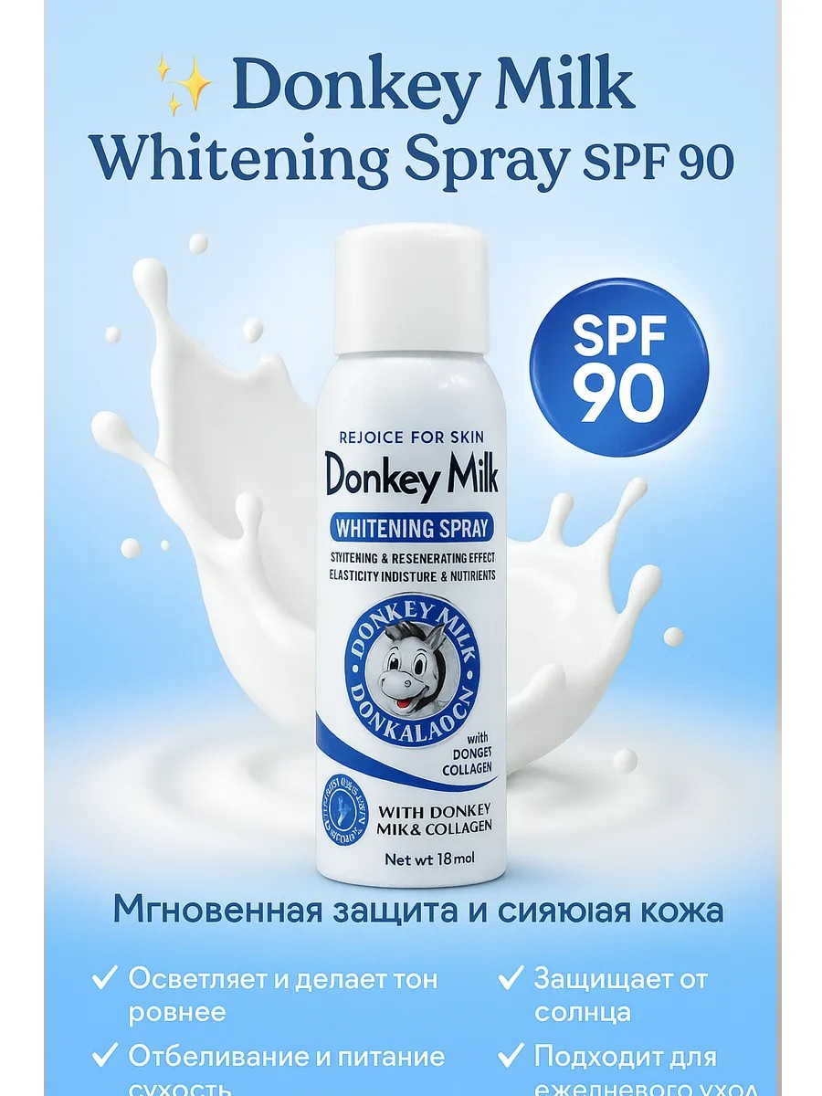 Отбеливающий спрей с ослиным молоком Donkey Milk Whitening Spray SPF 90 — современное средство для защиты кожи от солнца и её интенсивного ухода. Уникальная формула с натуральным ослиным молоком, витамином Е и коллагеном осветляет и выравнивает тон, устраняет тусклость и дарит коже здоровое сияние. Высокий фактор защиты SPF 90 надёжно блокирует воздействие UVA/UVB-лучей, предотвращая появление пигментации, морщин и признаков фотостарения.
