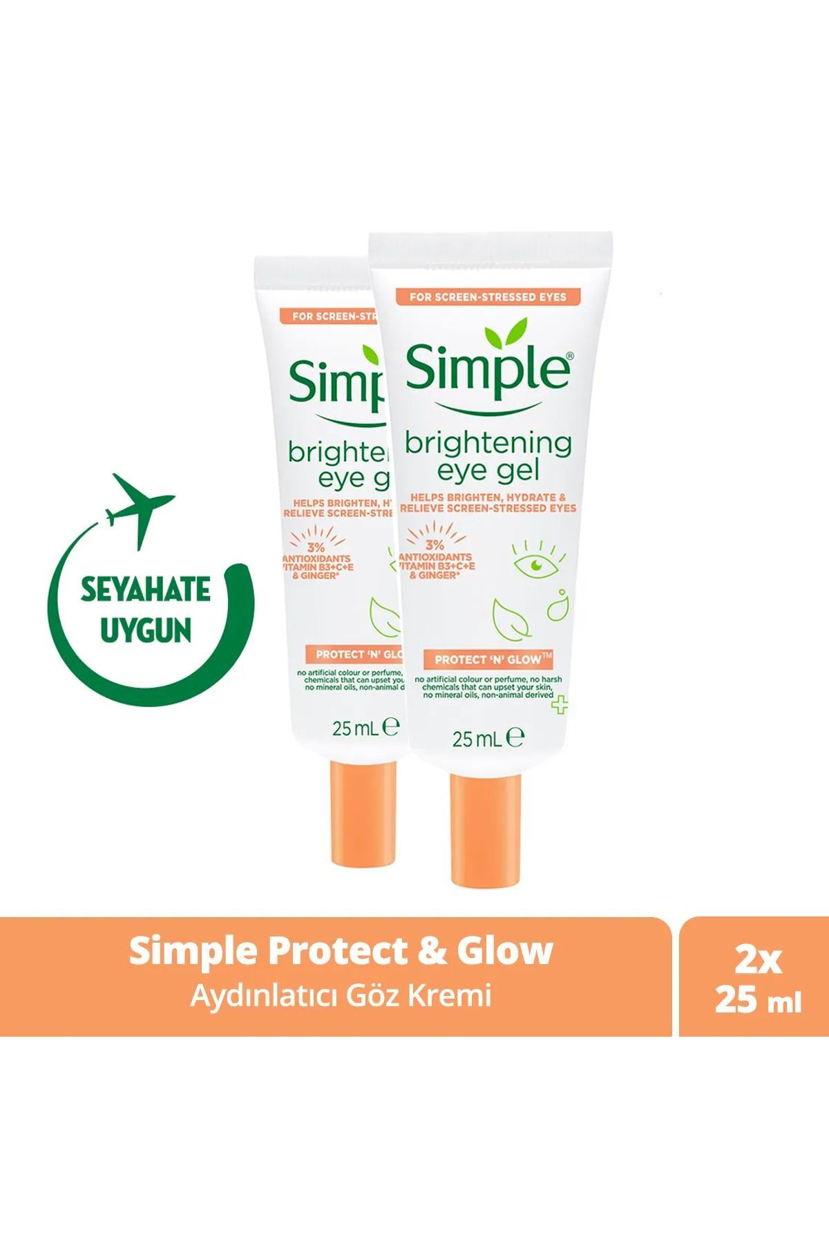 What are the secrets of a glowing skin? Let's name two: A good rest and a brightening eye cream suitable for your skin. Due to our busy schedule, sometimes we cannot take the necessary care of ourselves and the area around our eyes gives us away. Adding a new one to the illuminating creams used around the eyes, Simple has developed a wonderful product to add to your favorites. Simple Protect 'n' Glow Eye Cream helps reduce the appearance of dark circles around the eyes and eliminate the tired look. The presence of alfalfa in the gel provides antioxidant protection to your skin against blue light from the screen. You can complete your skin care routine with the gel that instantly moisturizes and brightens your eye area. Simple Protect 'n' Glow Eye Cream will never leave you alone with its content suitable for all skin types, including sensitive skin. You can use this indispensable illuminating eye cream in three different ways: As a cooling gel for swollen eyes in the morning, as a base you can use before applying make-up, and as a soothing agent for tired eyes during the day. So, whatever you need at that moment, Simple is there for you. Let us give you a little tip for your new eye contour brightening cream added to your routine you can get better results by keeping the product in the refrigerator. Simple Protect 'n' Glow Eye Cream, the new companion of kind-hearted skin care, does not contain harsh chemicals, perfumes, parabens and mineral oil. Simple's products, which care about animals and the planet we live in as much as they care about you, have not been tested on animals. Like all Simple products, this new moisturizing eye gel is PETA approved and vegan. Meet Simple Protect and Glow Eye Cream and shine with the glow of good-hearted skin care! Product Content: Aqua, Propanediol, Niacinamide, Glycerin, Tetrahydroxypropyl Ethylenediamine, Caprylyl Glycol, Phenoxyethanol, Carbomer, Saccharide Isomerate, Citric Acid, Hydrolyzed Lupine Protein, Disodium EDTA, Medicago Sativa Seed Extract, Tocopheryl Acetate, Sodium Ascorbyl Phosphate, Sodium Citrate, Ethylhexylglycerin, Zingiber Officinale Root Juice.