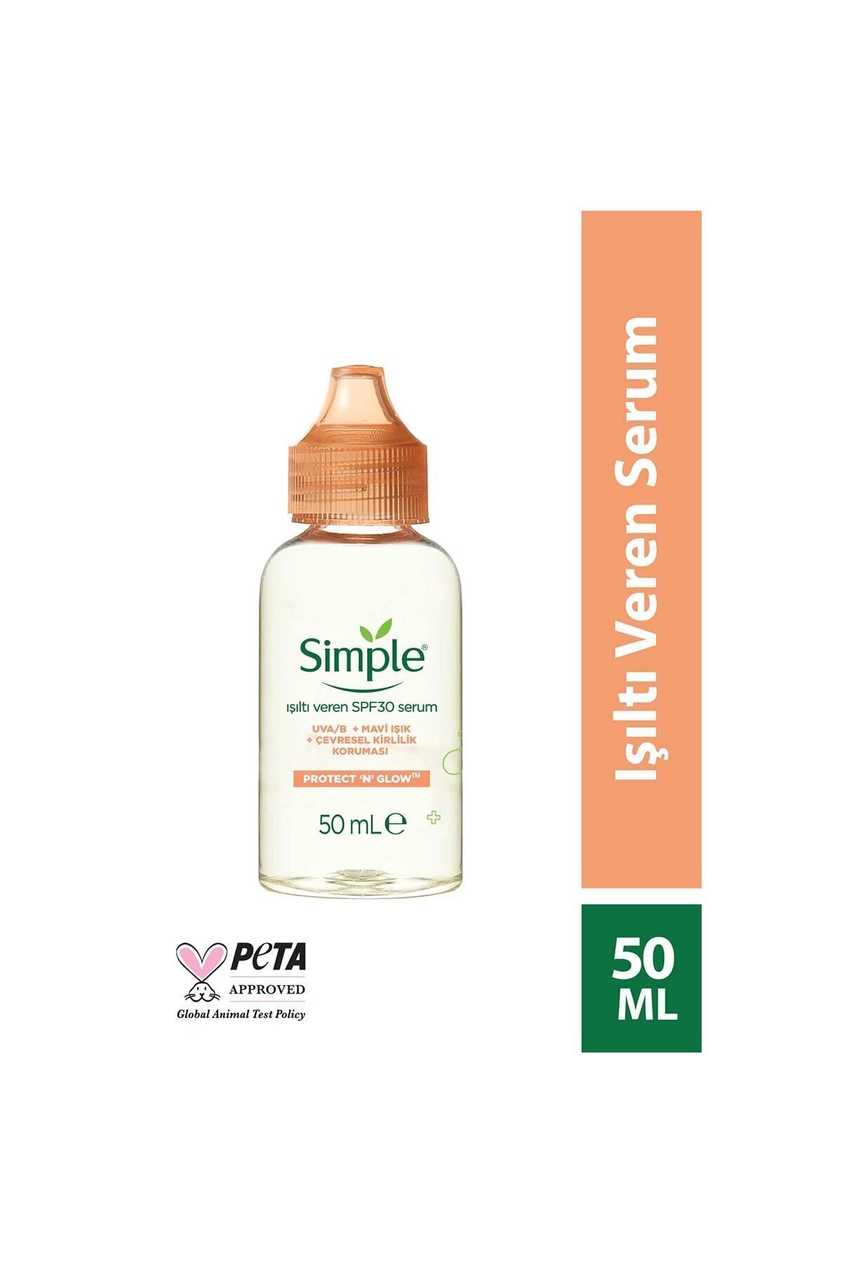 Simple Protect 'N' Glow Isilti Veren SPF30 Serum 50 mlCildine isilti verecek bir serum mu ariyorsun?Seni bu kararsizliktan kurtaracak bir cilt bakim ürünü ile tanismak ister misin? Simple Protect Glow Isilti Veren SPF30 Vitamin E içeren Cilt Bakim Serumu.Günes isigi, mavi isik ve çevresel faktörler cilde zarar verirken cildin erken yaslanmasina da sebep olur. Ihtiyacin olan cilt bakimi rutinini, cildine nazik davranan ama güçlü etkileri olan bir ürün ile daha etkili bir hale getirmektir. Iste tam da böyle zamanlarin kurtaricisi olan Simple Protect Glow Isilti Veren SPF30 Vitamin E içeren Cilt Bakim Serumu cildini günes isigi, mavi isik ve çevresel kirlilige karsi korur. Erken yaslanma belirtilerini ve yorgun cilt görünümünü önlemeye yardimci olur. Isiltili bir cilt için Vitamin E içeren formülüyle antioksidan etkisi saglar ve gençlik isiltini korur!Simple, tertemiz içerigi ile tüm hassas ciltler için kusursuz bir bakim saglar vazgeçilmez cilt bakimi ürünlerinden biri olur. Içerisinde paraben, alkol, parfüm, renklendirici, mineral yaglar ve hayvansal içerik bulundurmayan iyi kalpli formüle sahiptir. Cilt dostu Simple ürünlerin tamami vegan formülasyonludur ve hayvanlar üzerinde denenmedigi PETA tarafindan onaylanmistir. Bu sayede Simple Protect Glow Isilti Veren SPF30 Vitamin E içeren Cilt Bakim Serumu, nazik ama güçlü etkisiyle birkaç adimda cilt bakim rutinin vazgeçilmezi olacaktir.Yogun koruma saglayan Simple Protect Glow Isilti Veren SPF30 Vitamin E içeren Cilt Bakim Serumu, en iyi sonucu almak için avucunuza damlatin, yüzünüze nazikçe bastirarak dagilmasini saglayin. Günlük nemlendiricinizden önce veya sonra kullanabilirsiniz. Iste isiltini korumak bu kadar kolay! Simple ile cildin çok daha parlak ve canli. Simple Protect Glow Isilti Veren SPF30 Vitamin E içeren Cilt Bakim Serumu, yüz bakim serumu her bakim aninda seninle.Simple, herkes için iyi kalpli cilt bakimi.Ürün Içerigi: Isostearyl Alcohol, Isopropyl Palmitate, Octyldodecanol, Triolein, Octocrylene, Homosalate, Ethylhexyl Salicylate, Butyl Methoxydibenzoylmethane, Tocopheryl Acetate, Pentaerythrityl Tetra-di-t-butyl Hydroxyhydrocinnamate, Tocopherol.