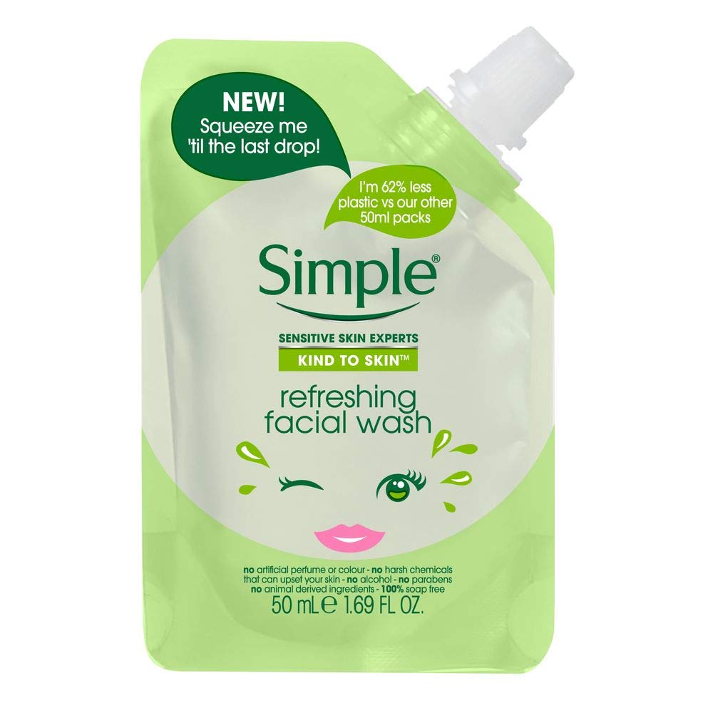Live, laugh, love and with our new Simple Mini Refreshing Facial Wash keep your skin fresh and happy wherever you are, wherever you go! Not only does this skincare essential leave our skin feeling thoroughly cleansed and revived, this gel formula feels lightweight and refreshing, and is 100% soap free too! Thanks to our special blend of skin-loving ingredients, including Pro-Vitamin B5, this facial cleanser helps to soften and gently cleanse skin. Reduce plastic use by choosing products that are made with 62% less plastic packaging! This simple face wash comes in super cute, flexible and ultra-light packaging that fits right inside your handbag. It’s a perfect travel size too (50ml) and just pure Simple goodness from inside-out. Use for both your morning and evening cleanse. Taking the time to be kind to your skin twice a day with a relaxing cleanse is a great beauty habit to get into – not only does it help to leave our skin feeling happy and healthy-looking, but taking that little bit of 'me time' can work wonders for our wellbeing too. Just work a small amount into a lather then massage into your skin to help remove any dirt, impurities and traces of make-up. At Simple we know that all skin can feel sensitive from time to time, which is why all of our products are perfect even for sensitive skin. If you find that some cleansers make your skin feel dry, stick with Simple and choose gentle products like our Refreshing Facial Wash to help leave your skin feeling revived and refreshed. It contains no artificial perfume or colour, no harsh chemicals that can upset your skin, no alcohol, no parabens and no animal derived ingredients. Don't forget to finish your skincare regime with one of our Simple moisturisers to hydrate and nourish your skin too! This refreshing face wash works well with our hydrating light moisturiser or our protecting light moisturiser with SPF15 that also come as squeezable travel packs with less plastic use (make your own holiday toiletry set). INGREDIENTS Aqua, Cocamidopropyl Betaine, Propylene Glycol, Sodium Chloride, Hydroxypropyl Methylcellulose, Panthenol, Disodium Edta, Hydroxypropyl Cyclodextrin, Iodopropynyl Butylcarbamate, Pantolactone, Phenoxyethanol, Sodium Hydroxide, Tocopheryl Acetate SAFETY WARNING Warning: for external use only. Avoid getting in your eyes MANUFACTURER CONTACT INFORMATION Unilever House Springfield Drive Leatherhead Kt22 7Gr See moreOur mini facial cleanser helps maintain skin's natural barrier, leaving skin soft, revived and refreshed. Made with 62% less plastic packaging, this super light travel mini face wash fits right inside your handbag. Simple Mini Kind To Skin Refreshing Facial Wash is a skin cleanser which thoroughly cleanses and keeps your skin revived.