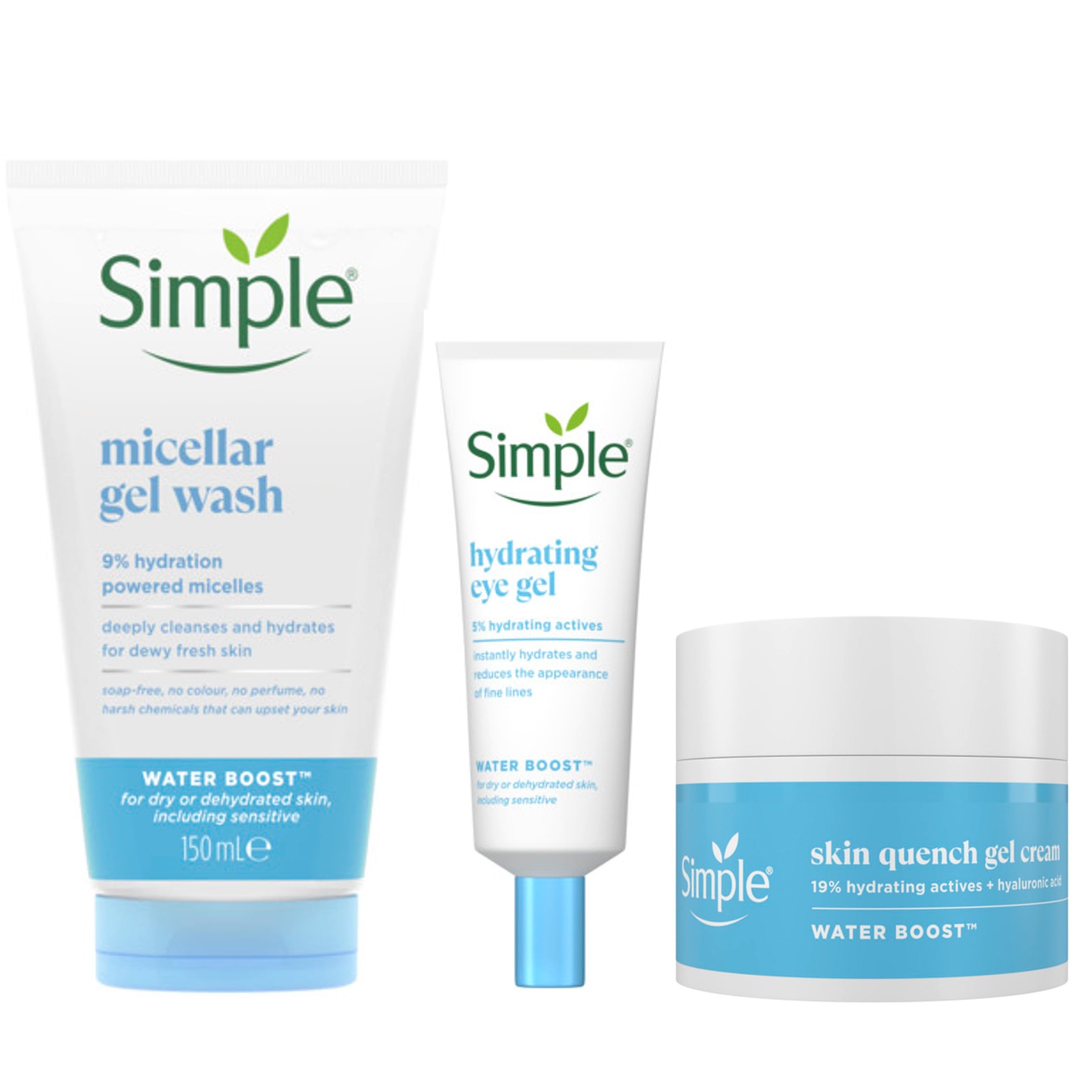 Simple Water Boost Skin Quench Gel Face Cream for Dry Skin 50 ml + Simple Water Boost Micellar 100% Soap-Free Face Cleanser Gel 150 ml & Simple Water Boost Hydrating Eye Gel 25 ml