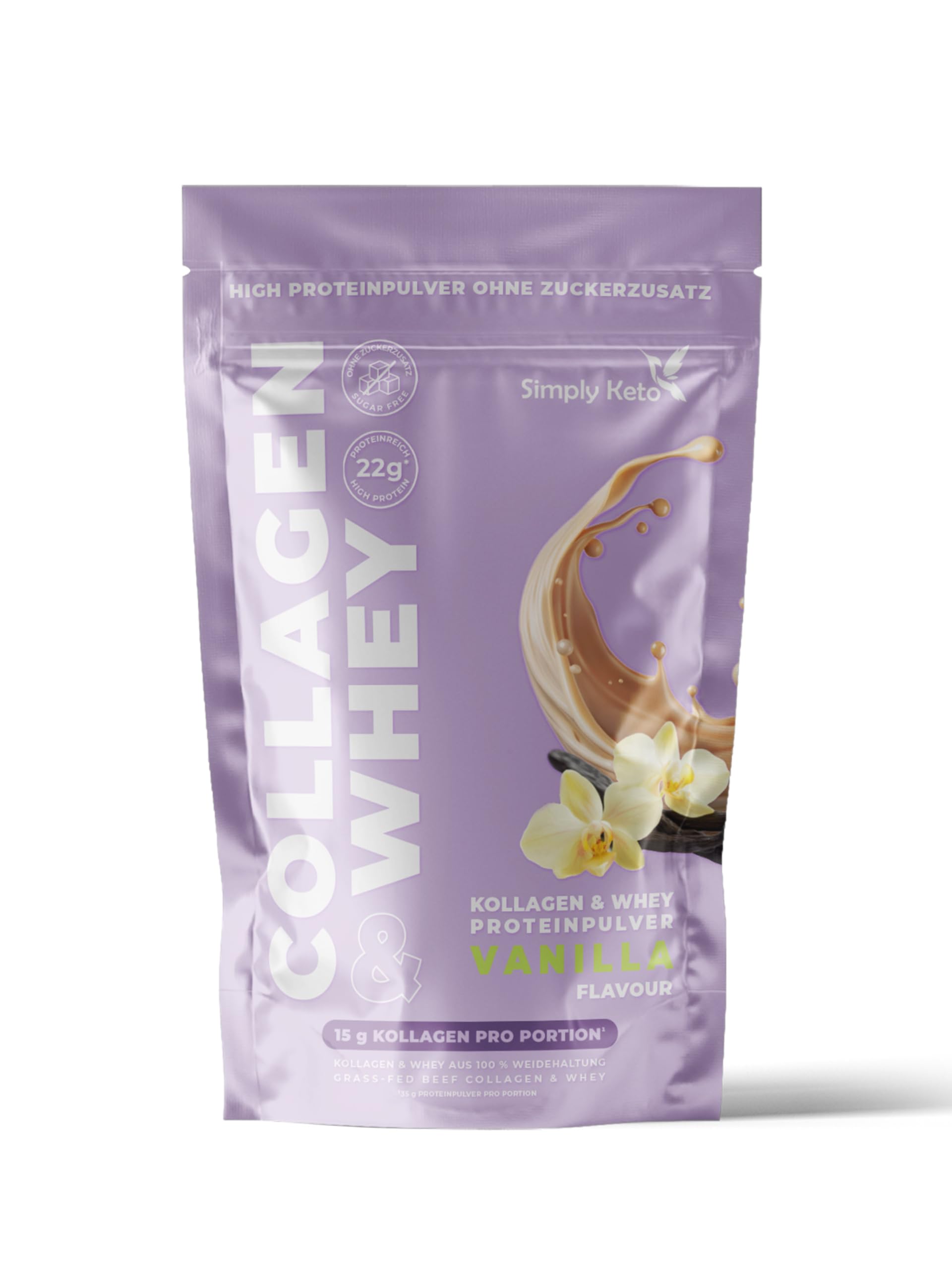 Vanilla Collagen Whey Protein Powder – Keto Shake with fewer carbs, 22g of protein, 0.5g net carbs, gluten-free, sweetened with stevia, grass-fed, 15 servings INGREDIENTS Beef collagen hydrolysate, cow whey protein concentrate, sweetener (99 erythritol, steviol glycosides 1 ), inulin, flavoring, thickener (xanthan gum), ground vanilla.Sugar-free and sucralose-free – Our Vanilla Collagen Whey Protein Powder is completely free of added sugar and sucralose. A 525g container provides 15 delicious shakes. Simply mix 35g of powder with 200ml of unsweetened almond milk – versatile and easily soluble. Gluten-free and soy-free – Our vanilla shake is free of gluten and soy, so you can enjoy it worry-free. It's also lab-tested, guaranteeing the highest quality for your diet. Low-carb and keto-friendly : With only 0.5g of usable carbs per serving, our protein powder is perfect for a low-carb or ketogenic diet. Naturally sweetened with stevia and erythritol – no added sugar or sucralose. Collagen and Pasture Care: The unique combination of collagen hydrolysate and pasture-raised beef whey protein provides your body with essential amino acids. Ideal for maintaining and building muscle mass and supporting healthy bones.¹ Protein-Rich Vanilla Shake - Enjoy the delicious taste of vanilla in a creamy shake. Our collagen and whey protein powder provides 22g of high-quality protein per serving, supporting your daily protein intake.Poudre de protéines de collagène et de lactosérum à la vanille – Keto Lower Carb Shake, 22 g de protéines, 0,5 g de glucides nets, sans gluten, stévia sucré, pâturage 15 portionsDESCRIPTION DU PRODUIT DESCRIPTION DU PRODUIT Poudre de protéine de lactosérum de collagène vanille – Kéto Shake avec moins de glucides, 22 g de protéines, 0,5 g de glucides nets, sans gluten, sucré avec de la stévia, nourri à l'herbe, 15 portions INGRÉDIENTS Hydrolysat de collagène de bœuf, concentré de protéines de lactosérum (Whey) de vache, édulcorant (99 érythrite, glycosides de stéviol 1 ), inuline, arôme, épaississant (xanthane), vanille moulue.Sans sucre et sans sucralose – Notre collagène et poudre de protéines de lactosérum à la vanille est entièrement sans sucre ajouté ni sucralose. Avec une contenance de 525 g, vous recevrez 15 délicieux milkshakes. Il suffit de mélanger 35 g de poudre avec 200 ml de lait d'amande non sucré - Polyvalent et facilement soluble. Sans gluten et sans soja - Notre shake à la vanille est exempt de gluten et de soja, de sorte que vous pouvez en profiter sans souci. En outre, elle est testée en laboratoire et garantit la plus haute qualité pour votre alimentation. Faible teneur en carbone et respectueux de la kéto : avec seulement 0,5 g de glucides utilisables par portion, notre poudre de protéines s'adapte parfaitement à un régime pauvre en glucides ou cétogène. Naturellement sucrées avec de la stévia et de l'érythritol – sans sucre ajouté ni sucralose. Les collagènes et le soin de pâturage : la combinaison unique d'hydrolysat de collagène et de protéines de whey de bœuf de pâturage fournit à votre corps des acides aminés essentiels. Idéal pour le maintien et le développement de la masse musculaire ainsi que pour soutenir des os sains¹. Shake vanille riche en protéines - Profitez du délicieux goût de la vanille dans un shake crémeux Notre poudre de protéines de collagène et de lactosérum vous fournit 22 g de protéines de qualité supérieure par portion et soutient ainsi votre apport quotidien en protéines.