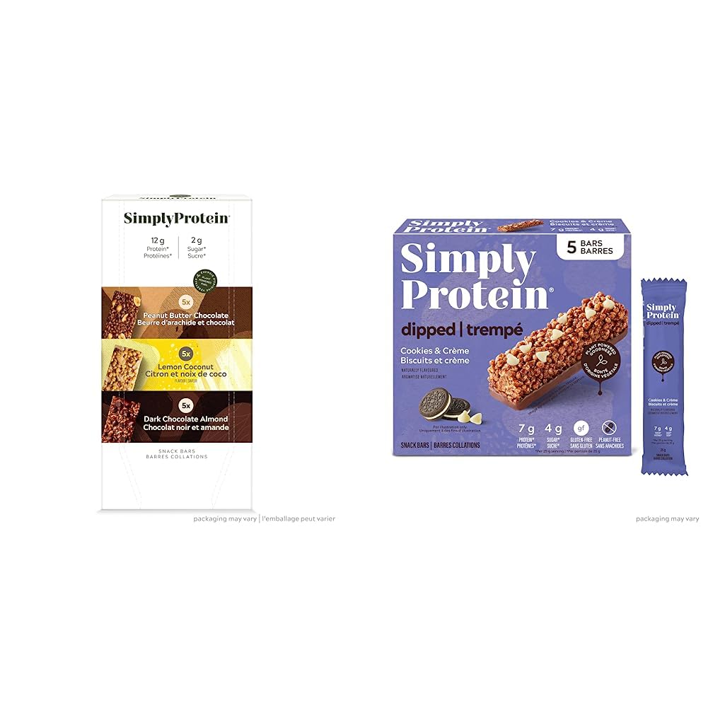 SimplyProtein Variety Pack, Plant Based, Very High in Fibre, Gluten Free, 2 g Sugar, Plant Powered Fuel, Snack Bar - Peanut Butter Chocolate x 5, Dark Chocolate Almond x 5, Lemon Coconut x 5 SimplyProtein Variety Pack, Plant Based, Very High in Fibre, Gluten Free, 2 g Sugar, Plant Powered Fuel, Snack Bar - Peanut Butter Chocolate x 5, Dark Chocolate Almond x 5, Lemon Coconut x 5 SimplyProtein Cookies Cream Chocolate-Dipped Kids Protein Snack Bars, 7g Plant Based Protein, Peanut Free, 5 Bars Kids and adults alike will love Simply Protein's new kids dipped protein bars made with plant-based protein. The perfect nut-free snack for your kid's school lunch, or the plant-based fuel you need for your busy on the go shcedule.PEANUT FREE KIDS SNACK: The chocolate-dipped Cookies Cream bars are safe for those with peanut allergies, making them a great school treat day option. They contain nutrients from veggie and fruit extracts. PERFECT FOR ON-THE-GO: Both the variety pack and the chocolate-dipped bars are individually wrapped, making them a nutritious on-the-go energy snack to enjoy anywhere perfect for school snack or lunch, as an afternoon snack or anytime. PLANT-POWERED GOODNESS, MADE SIMPLY: As a treat or an on-the-go snack, these plant-based protein bars provide your needed energy in a convenient and nutritious form. The chocolate-dipped bars are low in fat and carbs, making them a satisfying vegan snack. SNACK BETTER: Simply Protein Bars contain 12 grams of protein, 2 grams sugar, and are filled with 7 grams of fiber these gluten-free snacks are also kosher and a great source of iron. The chocolate-dipped bars have 7g protein, 4g sugar, and are peanut-free. LIGHT AND CRISPY: Make these vegan protein snacks your next favorite protein bars high protein low sugar creamy, rich and satisfying any time of day. The Simply Protein variety pack contains 15 gluten-free, vegan bars while the chocolate-dipped bars (Cookies Cream) come in a pack of 5.