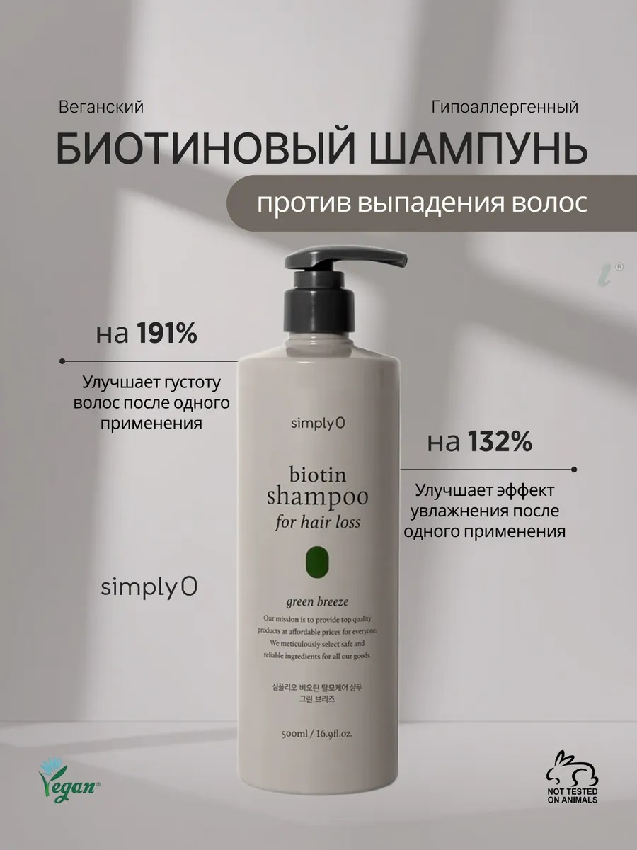 Шампунь для волос Biotin Shampoo for Hair Loss Green Breeze с биотином от выпадения волос— это веганский, гипоаллергенный шампунь, созданный для борьбы с истончением и выпадением волос с использованием нежных, высокоэффективных ингредиентов растительного происхождения, которые делают волосы более густыми и сильными. Шампунь обеспечивает глубокое увлажнение, стимулирует рост волос и препятствует выпадению. Продукт создан на основе 94% натуральных ингредиентов и мягких ПАВ, он бережно очищает кожу головы и волосы, не вызывая раздражения и сухости.
