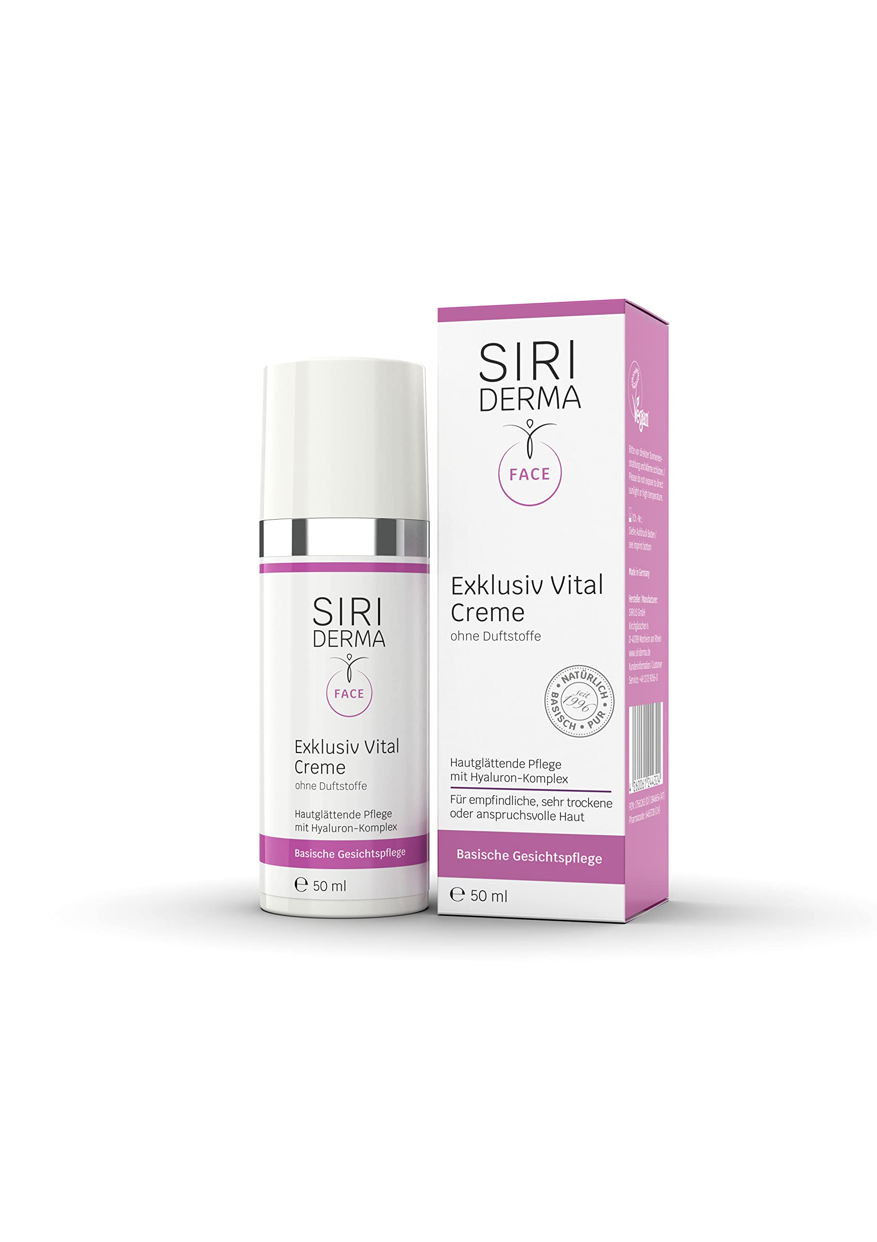 Basic effect: thanks to the basic active care approach, excess acids on the skin are neutralised. This supports the acid-base balance of the skin, relieves it and promotes its renewal. Special needs: the cream is ideal for sensitive, very dry or demanding skin and suitable for eczema, psoriasis or allergy-prone skin. It nourishes and soothes the skin without irritating. Basic care: with nourishing substances and high-quality, pure vegetable oils, this cream strengthens the skin barrier and intensively nourishes the skin, for noticeably softer, supple skin that is made to shine. Hydration: thanks to the SIRIDERMA hyaluronic complex, the Vital Cream provides intensive moisture, binds it in the skin for a long time and helps to reduce dryness wrinkles. For a fresh, plump complexion. Against skin ageing: The SIRIDERMA Exclusive Vital Cream actively works against premature skin ageing and wrinkles to make your skin look smoother and firmer. Perfect for mature skin that needs an extra dose of care.