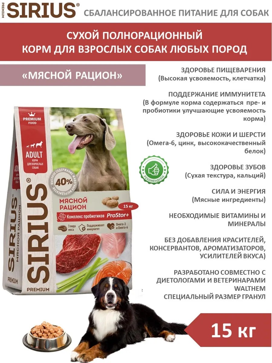 SIRIUS Сириус Корм для взрослых собак мясной рацион 15 кг