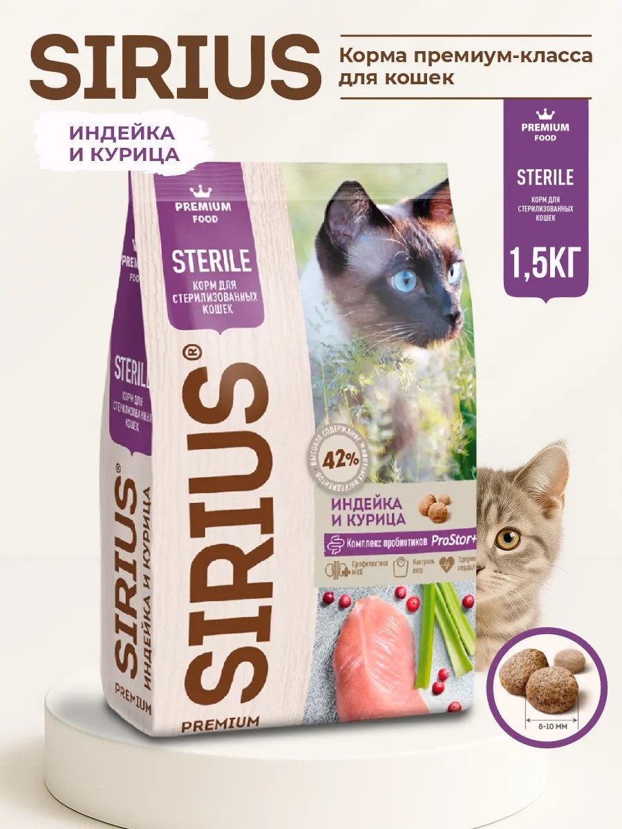 SIRIUS Корм для кошек, Индейка и Курица, 1,5 кг