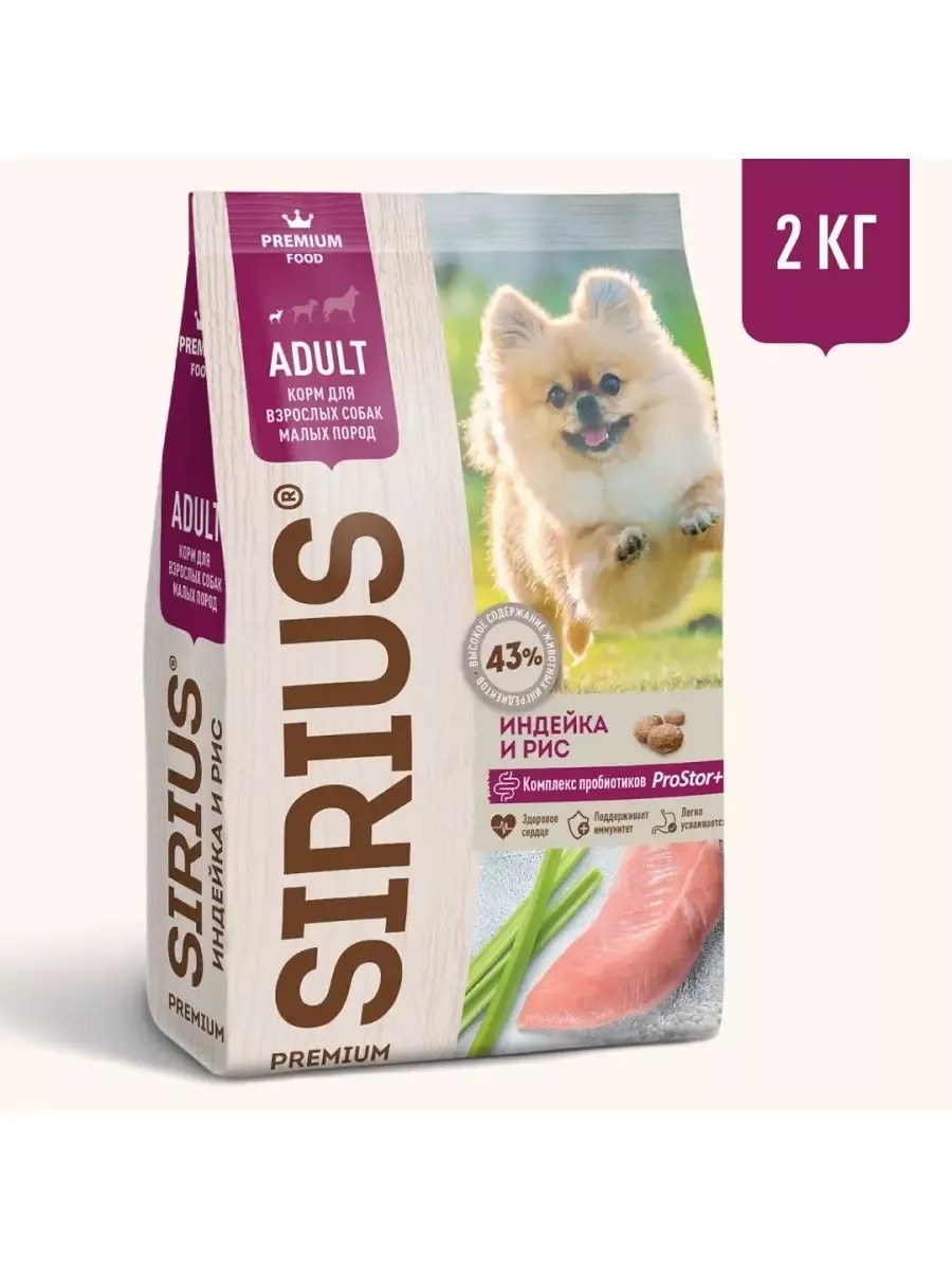 SIRIUS — сухой корм премиум-класса для полноценного ежедневного рациона взрослых собак малых пород. Высокое содержание мясных ингредиентов обеспечивает оптимальный уровень белка и укрепляет мышцы. Баланс витаминов и комплекса пробиотиков 4-го поколения PROSTOR+ нормализует пищеварение и укрепляет иммунитет. Омега 3 и Омега 6 способствуют поддержанию здоровья сердца, мозга, нервной системы, здоровья кожи и красоты шерсти.