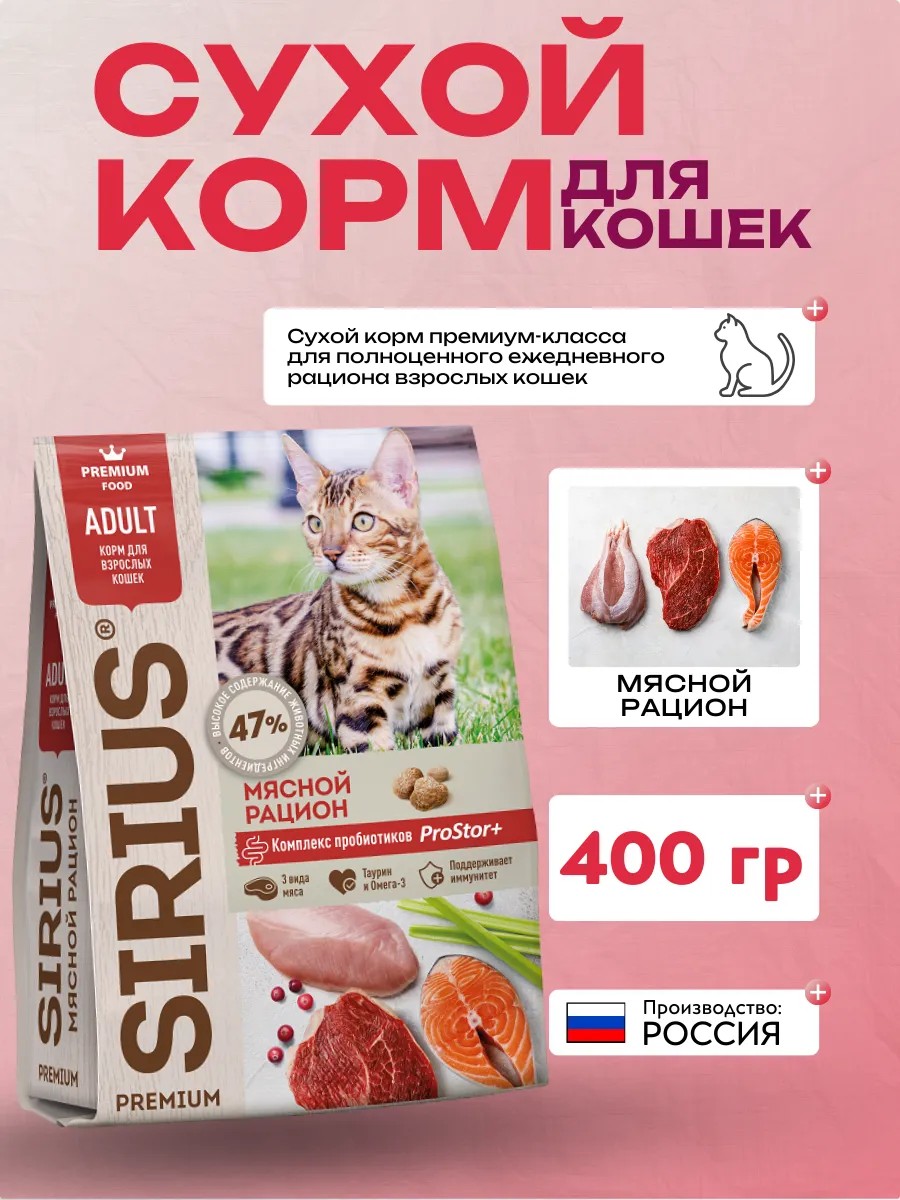 Комплектация1 мешок корма Sirius для взрослых кошек мясной рацион 400гр