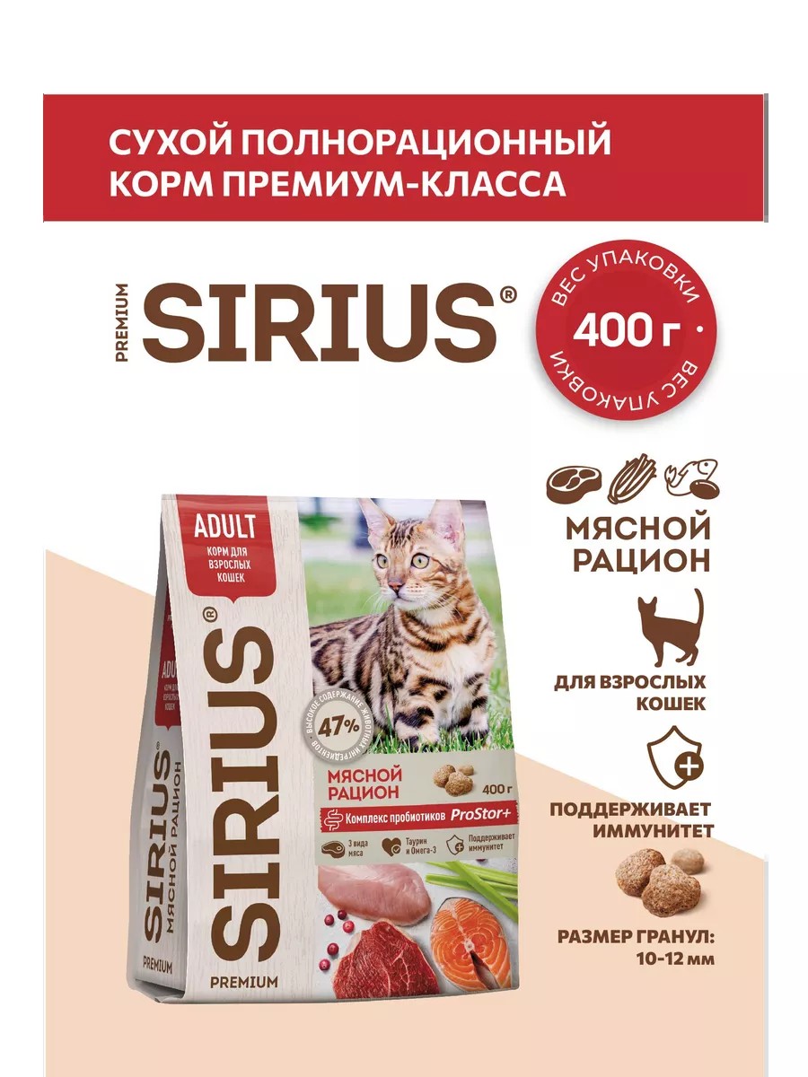 SIRIUS Сухой корм для взрослых кошек, Мясной рацион, 0,4 кг