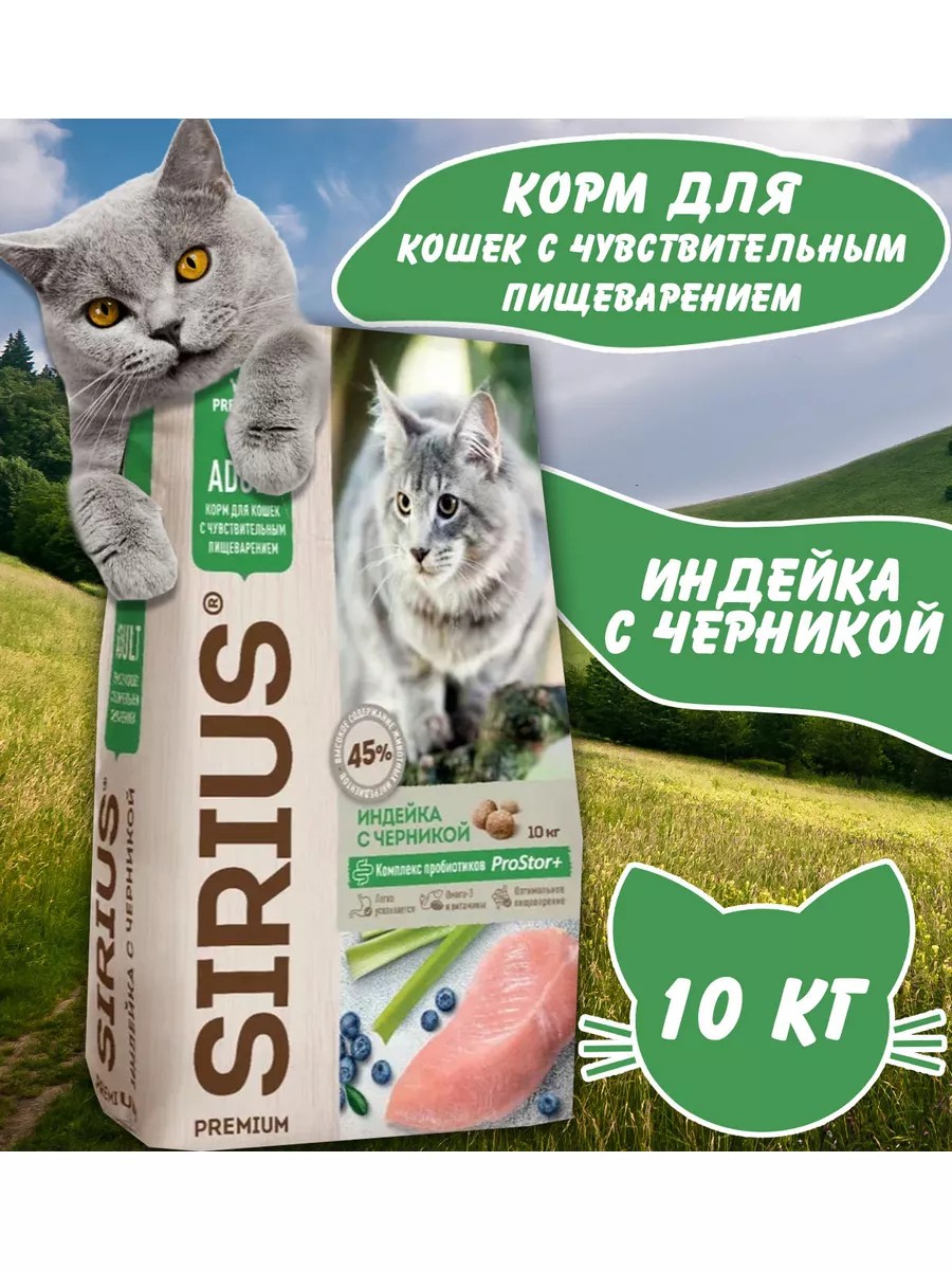 Сухой корм премиум-класса SIRIUS для кошек с чувствительным пищеварением Индейка с Черникой 10кг. SIRIUS — сухой корм премиум класса для полноценного ежедневного питания взрослых кошек с чувствительным пищеварением. Высокое содержание мясных ингредиентов обеспечивает оптимальный уровень белка и укрепляет мышцы. Пониженное содержание жиров для контроля веса. Баланс витаминов и комплекса пробиотиков 4-го поколения PROSTOR+ нормализует пищеварение и укрепляет иммунитет. Омега 3 и Омега 6 способствуют поддержанию здоровья сердца, мозга, нервной системы, здоровья кожи и красоты шерсти. Черника обладает бактерицидными свойствами и способствует обновлению клеток.