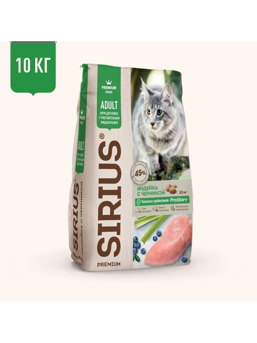 Полнорационный сухой PREMIUM корм для взрослых кошек с чувствительным пищеварением, Индейка с черникой, 10 кг. SIRIUS - сухой корм премиум класса для полноценного ежедневного питания взрослых кошек с чувствительным пищеварением. Высокое содержание мясных ингредиентов обеспечивает оптимальный уровень белка и укрепляет мышцы. Пониженное содержание жиров для контроля веса. Сириус содержит баланс витаминов и комплекса пробиотиков 4-го поколения PROSTOR+ нормализует пищеварение и укрепляет иммунитет. Омега 3 и Омега 6 способствуют поддержанию здоровья сердца, мозга, нервной системы, здоровья кожи и красоты шерсти. Черника обладает бактерицидными свойствами и способствует обновлению клеток.