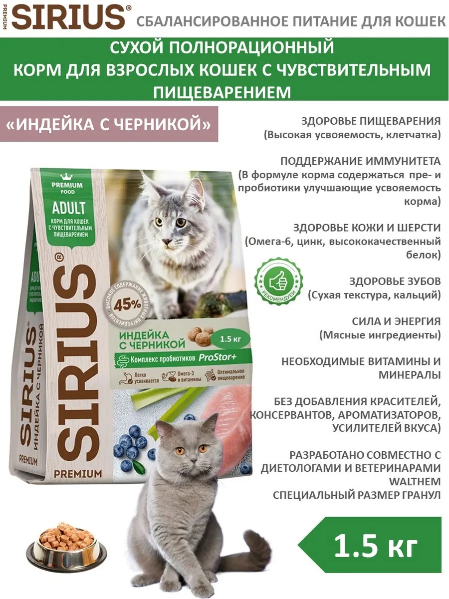SIRIUS Сухой корм для кошек с чувствительным пищеварением индейка с черникой 1.5 кг