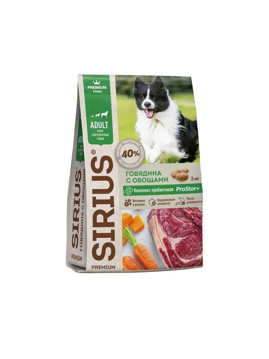 SIRIUS сухой корм премиум класса для полноценного ежедневного рациона взрослых собак. Высокое содержание мясных ингредиентов обеспечивает оптимальный уровень белка и укрепляет мышцы. Баланс витаминов и комплекса пробиотиков 4-го поколения PROSTOR+ нормализует пищеварение и укрепляет иммунитет. Омега 3 и Омега 6 способствуют поддержанию здоровья сердца, мозга, нервной системы, здоровья кожи и красоты шерсти. СОСТАВ:Дегидрированное мясо (говядина 14 %, курица 14%),кукуруза,пшеница,жир куриный,растительные волокна (источник клетчатки),гидролизованные мясные белки,дрожжи пивные сухие,жир лососевый 0.5%,морковь сушеная,тыква сушеная,пробиотический комплекс ProStor+ (Bacillus subtillis, Bacillus licheniformis, автолизат пивных дрожжей, пектиновый комплекс, эхинацея, ромашка),сельдерей сушеный,Юкка Шидигера. Корм не содержит искусственных красителей, ароматизаторов, ГМИ. Добавка на 1 кг: витамин А 15 000 МЕ, витамин Д3 1200 МЕ, витамин Е 300 МЕ, витамины группы В (В1, В2, В3, В4, В5, В6, В9, В12) 1448 мг, биотин 2мг, железо 130 мг, цинк 140 мг, марганец 19 мг, медь 13 мг, йод 2.6 мг, селен м 0,2 мг. Энергетическая ценность 3680 ккал/кг. АНАЛИЗ СОСТАВА: сырой протеин 24%, сырой жир 12%, сырая клетчатка 3,5%, сырая зола 8%, влажность 9%, кальций 1.5%, фосфор 0.9%. Сумма омега 6 и 3 жирных кислот 2,49%.
