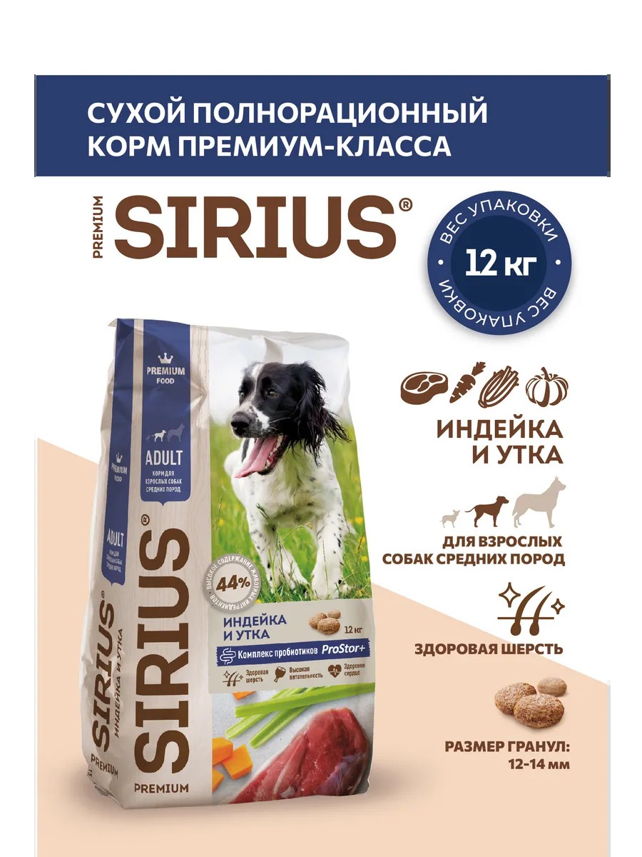 SIRIUS Сухой корм для средних собак с индейкой и уткой, 12кг