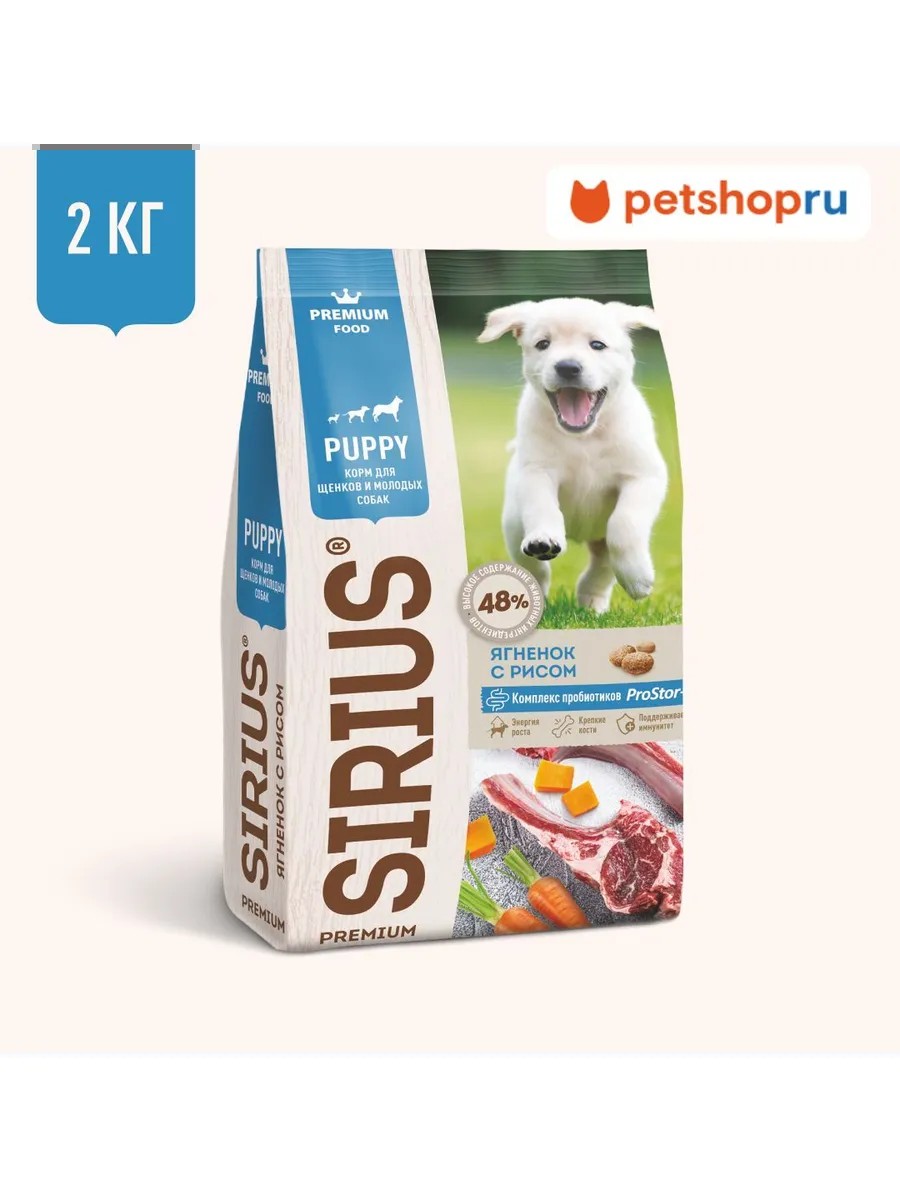 SIRIUS сухой корм для щенков и молодых собак с ягнёнком и рисом, сбалансированное питание для щенков и молодых собак всех пород от 1 месяца. Формула корма разработана с учётом особенностей быстрого метаболизма щенков и активного роста, включает качественные источники белка, обеспечивает сбалансированный уровень кальция, фосфора и магния. Ягнёнок -- источник легкоусвояемых белков и кальция, он способствует правильному развитию опорно-двигательного аппарата. Рис -- хороший источник энергии, легко переваривается и не вызывает аллергии. Корм содержит комплекс пробиотиков для нормализации пищеварения. Хранить в закрытом виде, в прохладном и сухом месте, избегать прямых солнечных лучей и влаги.