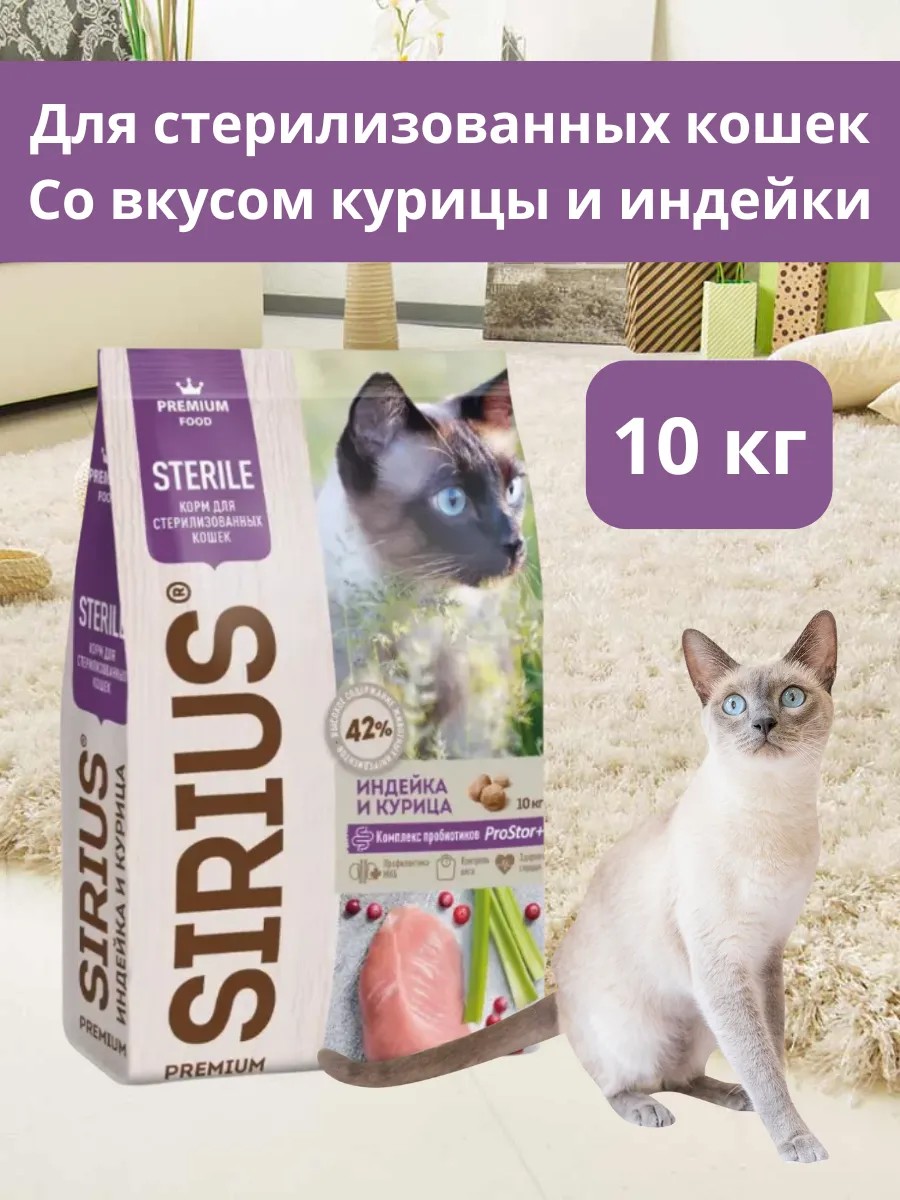 | Полное наименование товара | Сухой полнорационный корм для стерилизованных кошек, индейка и курица ТМ «SIRIUS» 10 кг |