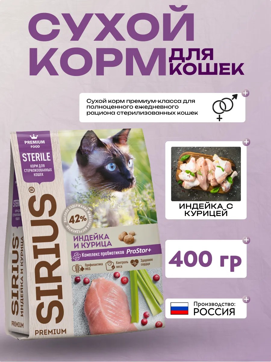 SIRIUS — сухой корм премиум-класса для полноценного ежедневного рациона стерилизованных кошек. Высокое содержание мясных ингредиентов обеспечивает оптимальный уровень белка и укрепляет мышцы. Пониженное содержание жиров для контроля веса. Баланс витаминов и комплекса пробиотиков 4-го поколения PROSTOR+ нормализует пищеварение и укрепляет иммунитет. Омега 3 и Омега 6 способствуют поддержанию здоровья сердца, мозга, нервной системы, здоровья кожи и красоты шерсти. Корм способствует профилактике мочекаменной болезни.