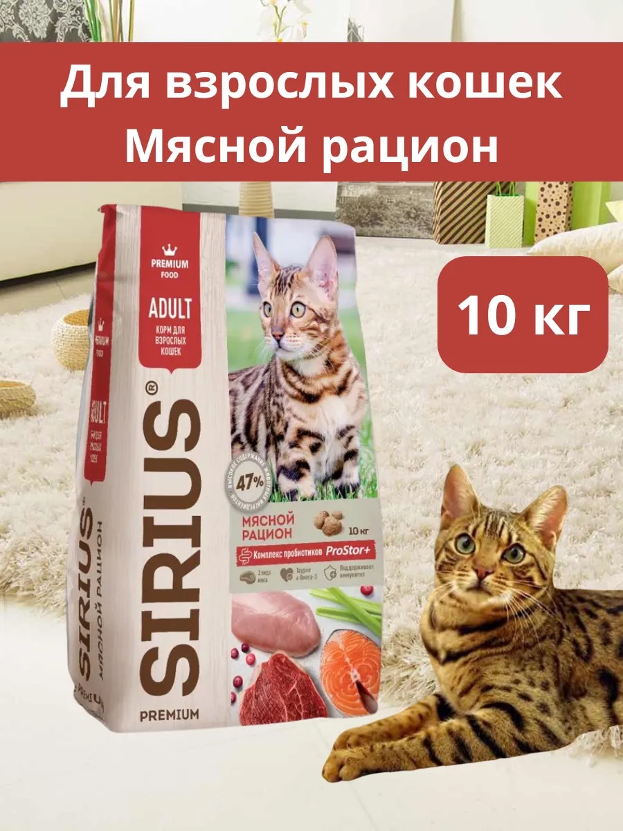 Полное наименование товараСухой полнорационный корм для взрослых кошек, мясной рацион ТМ «SIRIUS» 10 кг
