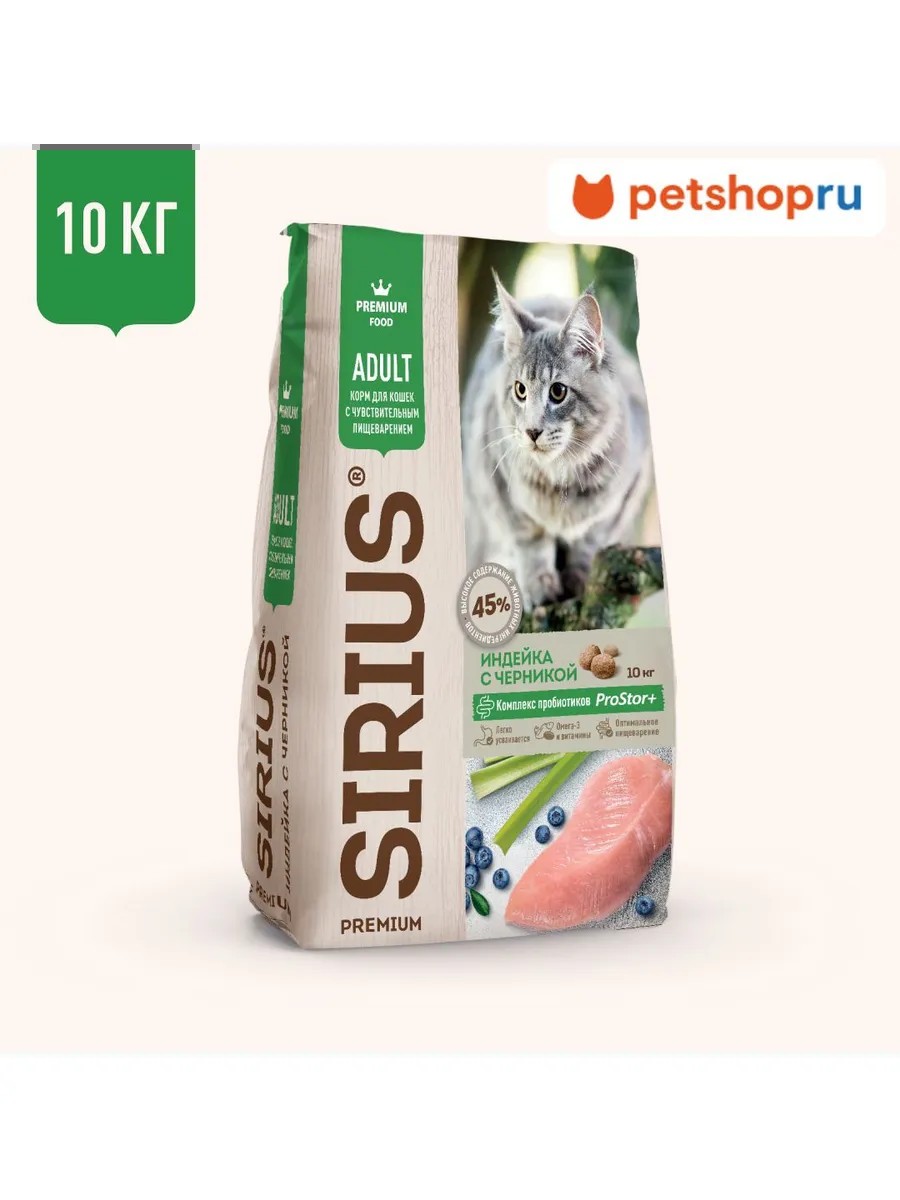 SIRIUS Корм для кошек с чувств.пищеварением,индейка с черникой,10кг