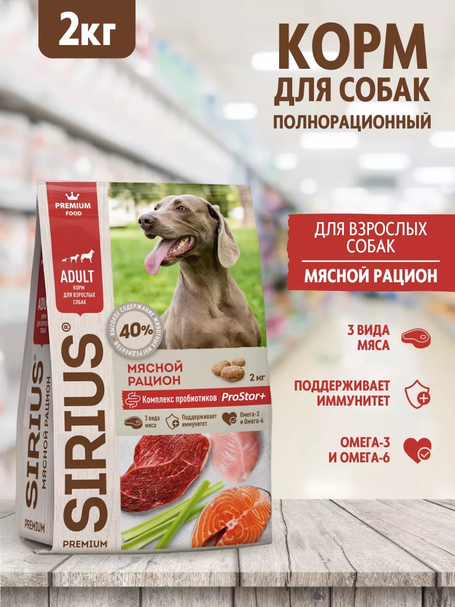 SIRIUS - полнорационный сухой PREMIUM корм для взрослых собак, Мясной рацион.