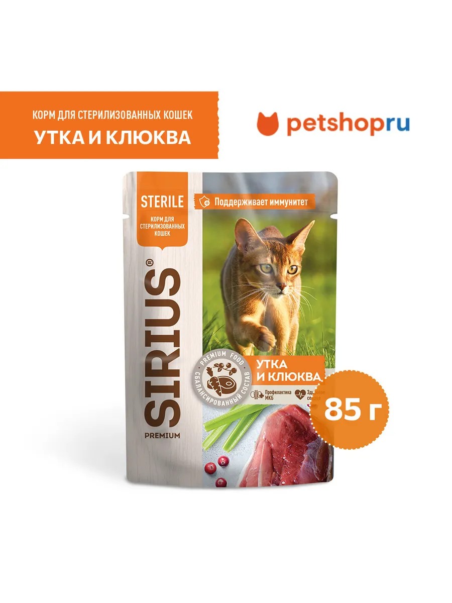 SIRIUS - влажный корм премиум-класса для полноценного ежедневного рациона стерилизованных кошек. Высокое содержание мясных ингредиентов обеспечивает оптимальный уровень белка и укрепляет мышцы. Пониженное содержание жиров для контроля веса. Корм содержит натуральные ингредиенты, а также все необходимые микроэлементы и витамины для здорового роста и развития питомца. Клюква способствует профилактике инфекций мочеполовой системы.