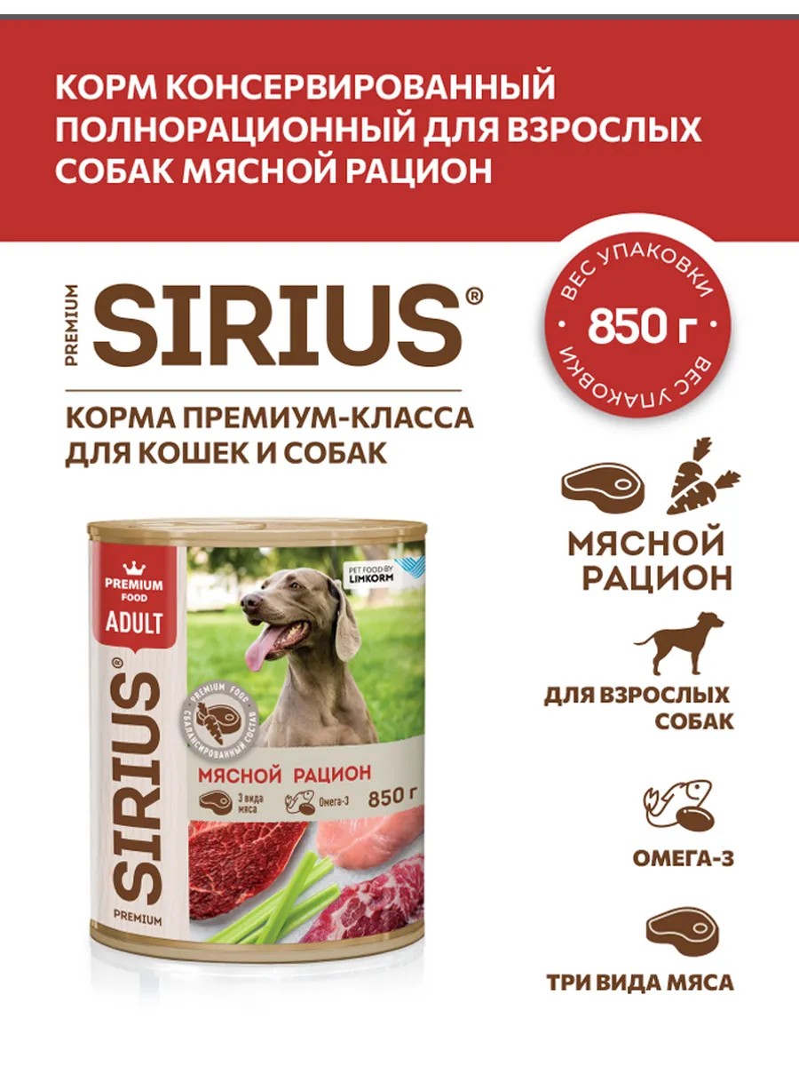 Влажный корм SIRIUS (Сириус) для собак – это современный продукт премиум – класса, изготовленный из натуральных мясных ингредиентов, обогащенный питательными веществами и минералами, которые обеспечивают полноценное и сбалансированное питание вашего питомца.