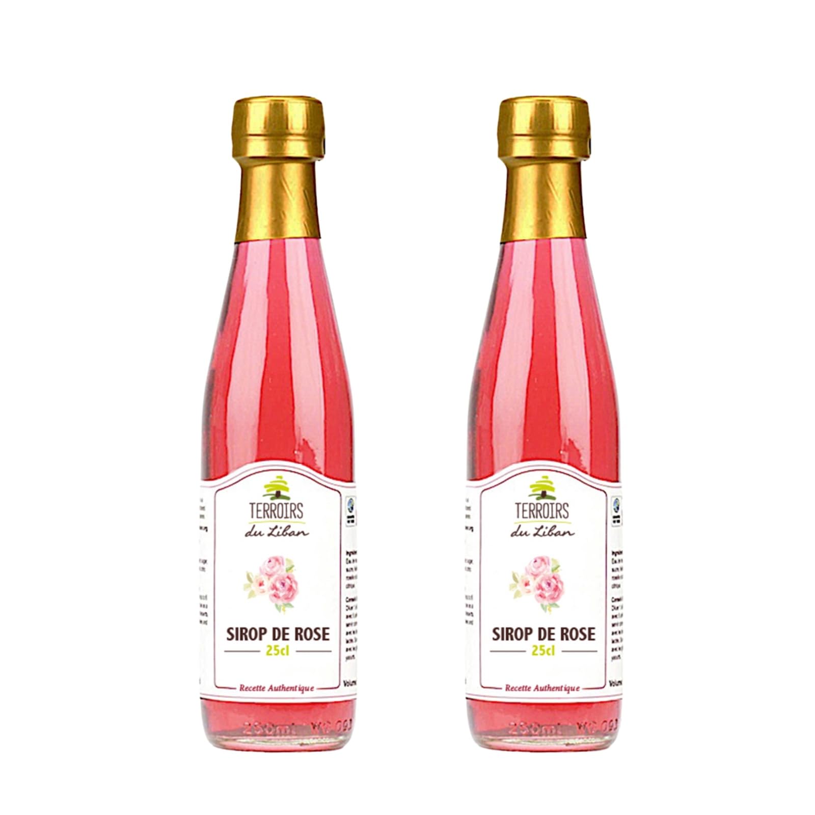 store for 2 years in a dry place. For a refreshing drink, dilute 1 part syrup in 6 parts cold water or serve as a drizzle over dairy desserts. Pairs well with cakes and yogurts. Exuding an enchanting fragrance, the rose is an essential flower in the culinary heritage of the Orient. Prepared according to the ancestral recipe of our forebears, this rose syrup, free of coloring and preservatives, infuses its precious and delicate notes into drinks and desserts. Simply dilute it in cold water for a refreshing and intensely floral break!Se conserve 2 ans au sec. Pour une boisson rafraîchissante, diluer 1 unité de sirop dans 6 unités d'eau froide ou servir comme coulis avec les desserts lactés. Se marie bien avec les gâteaux et les yaourts. Exhalant un parfum envoûtant, la rose est une fleur incontournable de l'héritage culinaire oriental. Préparé selon la recette ancestrale de nos aïeux, ce sirop de rose sans colorant ni conservateur diffuse ses notes précieuses et délicates dans les boissons et desserts. Diluez-le simplement dans de l'eau froide pour une pause rafraîchissante et intensément florale !.Sirop de Rose libanais Authentique- 100 Artisanale- Sans Colorant ni Conservateur- Idéal pour Boissons, Desserts Cocktails- Certifié Commerce Equitable- 2 x 25cl- Terroirs du Liban